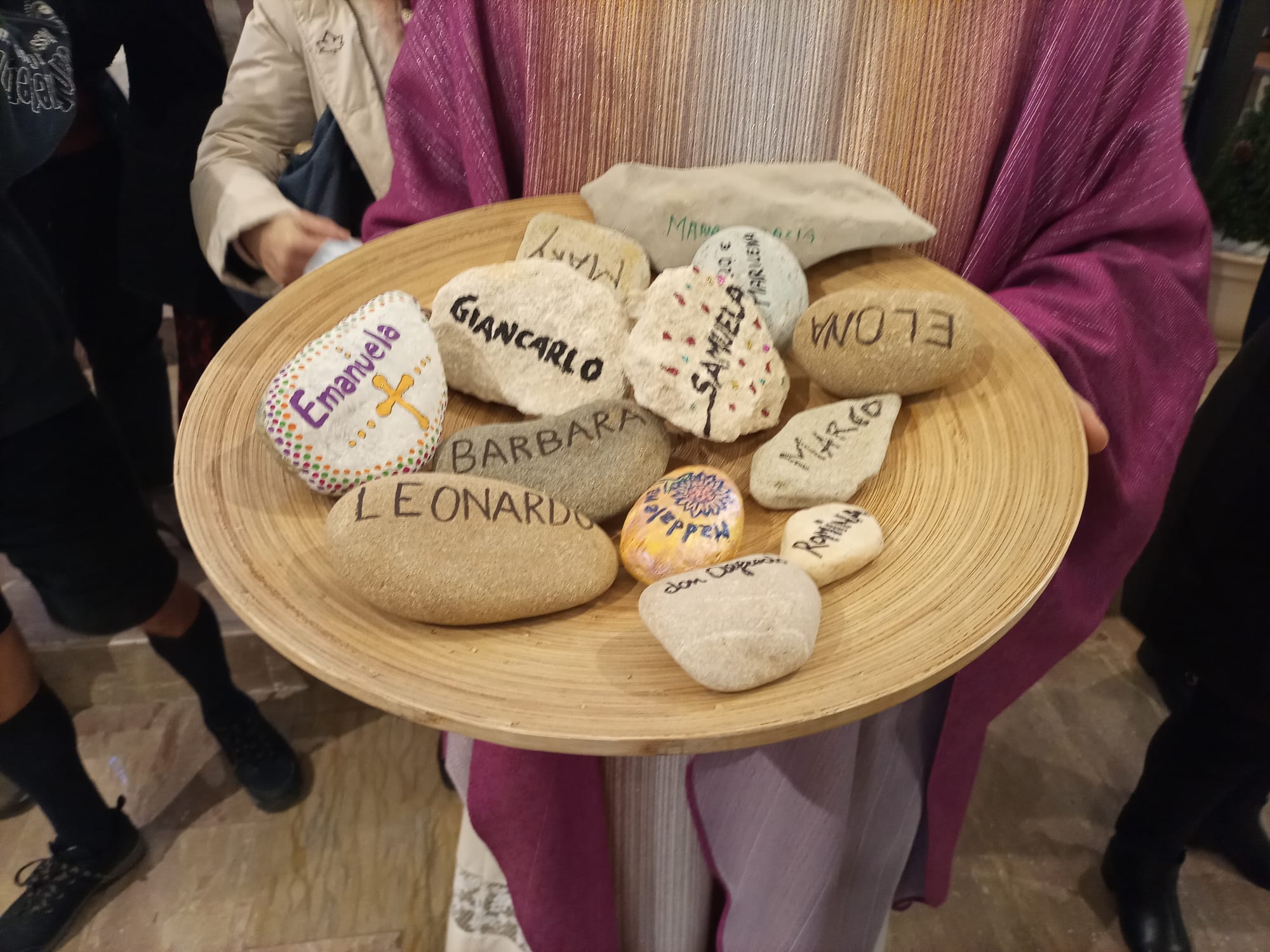 Tutti i membri del Consiglio, completamente rinnovato nella sua composizione, hanno presentato all’altare una pietra con su scritto il proprio nome: chi l’ha decorata, chi l’ha incisa, chi semplicemente ci ha scritto sopra. Un segno che ricorda quello che viene narrato nell’Antico Testamento, quando i patriarchi, dopo aver incontrato il Signore, costruivano un altare sul luogo dell’incontro. “Anche noi vogliamo stringere questa alleanza con Dio – affermano i componenti del nuovo CPP – La pietra è segno dell’amicizia con il Signore. Noi vogliamo camminare insieme tra di noi, ma stringendoci nell’alleanza con Lui.”