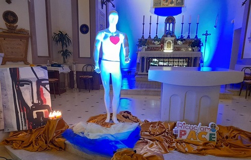 Mi garba da morire questo manichino perché ci permette di riprendere i tre momenti di riflessione sulla pace, evidenziando tre parti del corpo umano per commentare il messaggio di papa Francesco: i piedi per il dialogo tra generazioni, il cuore per l’educazione e le mani per il lavoro. Tessere vuol dire creare un dialogo. La prima cosa che stasera vogliamo imparare, pregando per la pace, è fare una sorta di bonifica del linguaggio per continuare a dialogare e tessere fili di pace. Occorre partire dalla tessitura e non dal prodotto finito. Per riprendere una frase di Chiara Scardicchio, noi, come creature, siamo chiamati a co-creare, non siamo chiamati a presentare il prodotto finito. Ecco, allora, il simbolo del piede, una parte del corpo che non si vede, ad indicare il fatto che il dialogo tra le generazioni debba avvenire nell’umiltà.