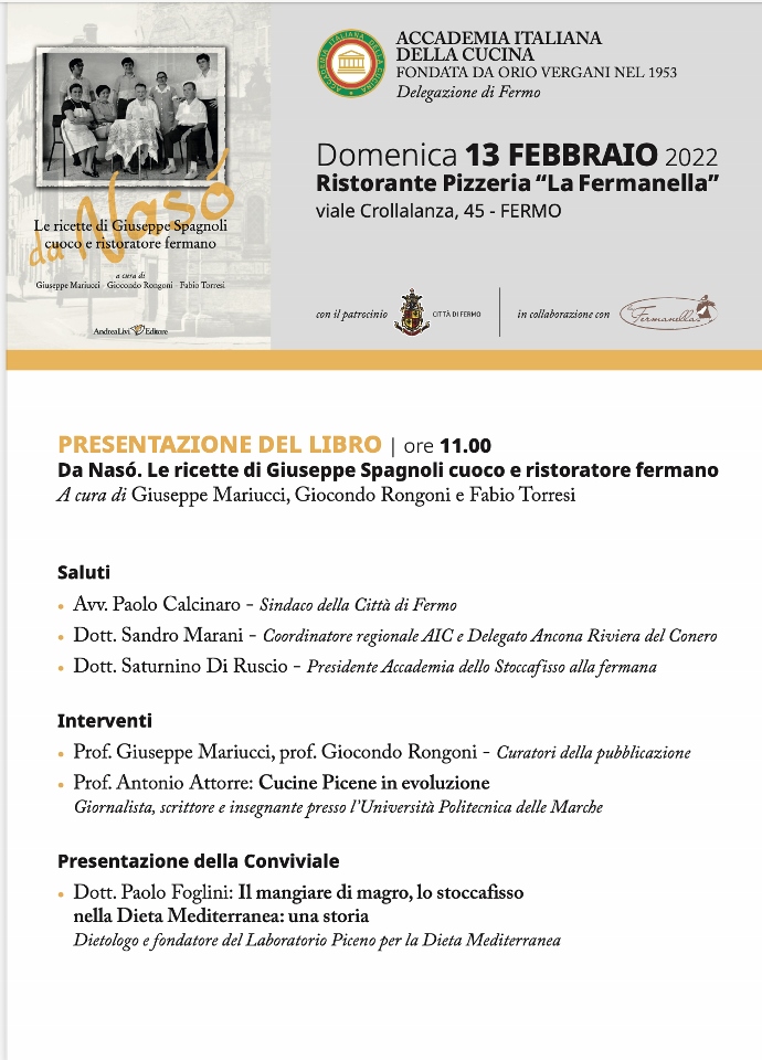 L’Accademia italiana della Cucina, delegazione di Fermo, ha infatti presentato ai suoi associati, ma non solo, il particolare e stupendo libro “Da Naso’: le ricette di Giuseppe Spagnoli cuoco e ristoratore fermano”, curato Giuseppe Mariucci (collaboratore dell’Ancora), Giocondo Rongoni e Fabio Torresi!
