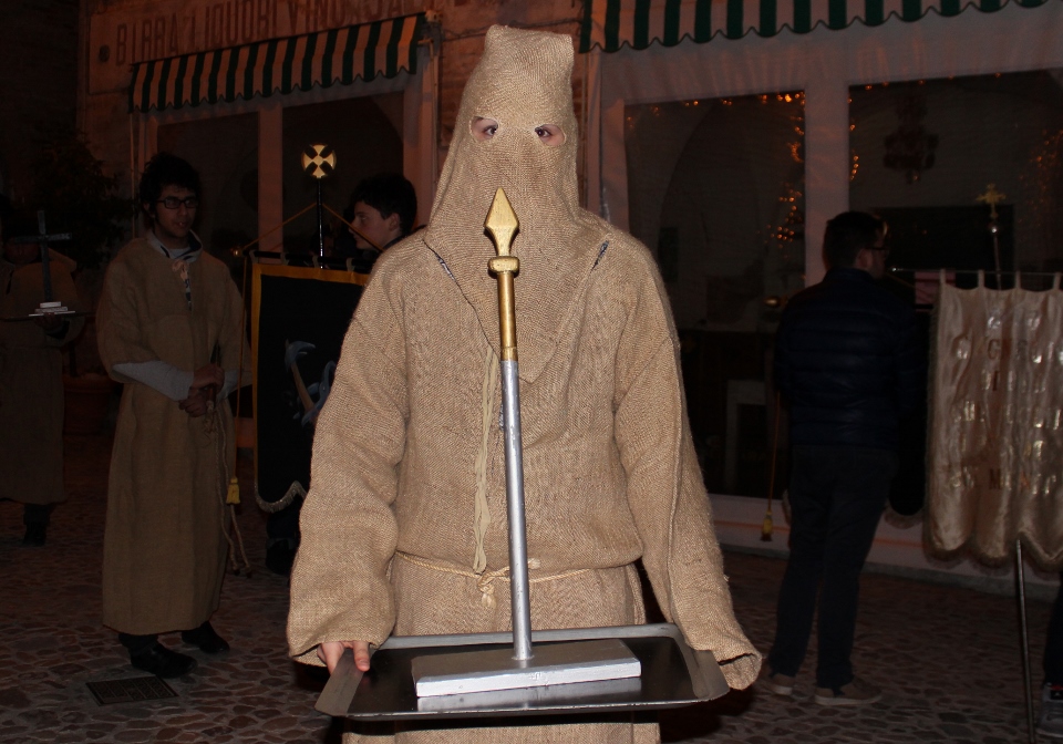 La Sacra Rappresentazione ha inizio alle 21,30. Precede il corteo una bianca cavalcata di soldati romani con le insegne imperiali, poi quattro a piedi che suonano le chiarine, arriva la nuda Croce, spoglia di legno povero, portata da un confratello della Confraternita dell’Addolorata e della Passione e morte di Gesù Cristo. Dopo la nuda Croce procede il 1° Coro delle bambine vestite di nero e velate che cantano: “A patir la cruda morte..”. Arriva il Cristo in veste rossa, rappresentato da un figurante appartenente alla famiglia Ottaviani, ruolo tramandato di padre in figlio. Il ramo di questa famiglia è quello di Zona Ascolani, ossia Grottammare Sud. Subito dietro il Cristo arriva il Cireneo in costume. A scortare Gesù ci sono 10 soldati romani a piedi, armati di tutto punto con lancia, gladio e scudo, nonché armatura, realizzata in stoffa imitando i soldati della Via Crucis della cinquecentesca chiesa di Santa Lucia a Grottammare. Dopo la Sacra rappresentazione, ha inizio il corteo processionale vero e proprio. Le vie sono buie, i figuranti hanno torce aldilà ed al di qua della processione. Ecco i Sacconi, che anticamente rappresentavano i nostri confratelli della Madonna dalle Sette Spade ( Addolorata) e della Buona Morte, che indossano il costume coprente usato per non farsi individuare quando andavano a curare gli ammalati o a compiere opere di bene o di sostegno, per non farsi riconoscere e quindi per non farsi ringraziare. Essi incappucciati e col saio di ruvida juta portano cuscini in velluto con sopra i simboli della Passione : Primo di tutti il Calice del Sacrificio Eucaristico, poi la borsa maledetta di Giuda con i 30 denari, il prezzo del tradimento, le funi che legarono Gesù quando venne issato sulla Croce, il sasso che colpì il Suo Volto, la mano che lo schiaffeggiò, la Veste Bianca simbolo di purezza, i dadi, usati dai soldati per giocarsi la Sua veste rossa, la tunica rossa, simboleggiante si il sangue e la passione ma anche la pazzia, con questa veste Pilato lo fece esporre sperando che il popolo considerandolo pazzo, lo salvasse, ma non fu così e la gente sobillata dai sacerdoti, scelse Barabba. Procede il 2° Coro delle Pie donne, le fanciulle in nero velate, sulle note di “La colpa muoia pur, muoia il peccato..”. Seguono altri sacconi con altrettanti simboli della Passione : la colonna, dove fu flagellato, i flagelli,la corona di spine, il Sacro Volto, cioè un fazzoletto con impressa la Sua immagine e poi una riproduzione della Sacra Sindone di Torino. Arrivano le donne e i fanciulli/e con mantelle nere che recano gli arazzi con le 14 Stazioni della Via Crucis. Ancora simboli: i chiodi e il martello, le tenaglie, la scala, l’anfora e la spugna imbevuta di aceto e legata in cima ad una canna per dissetare Gesù inchiodato sulla Croce. Sfilano ora i drappi di seta nera con le “Sette Parole” ( frasi) pronunciate da Gesù nella Sua agonia : 1) Padre perdona loro perché non sanno quello che fanno; 2) Oggi sarai con me in Paradiso”; 3) Donna ecco tuo figlio, figlio ecco tua madre”; 4) Dio mio Dio mio perché mi hai abbandonato?”; 5) Ho sete”; 6) “Tutto è compiuto”; 7) “Padre nelle tue mani raccomando il mio spirito”.