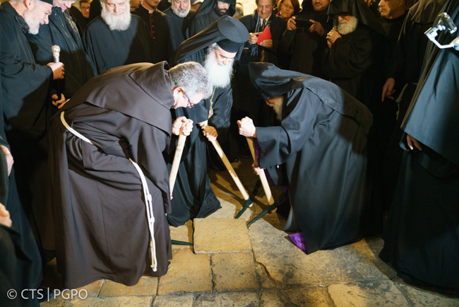 Si è svolta il 14 marzo, presso la Basilica del Santo Sepolcro, la cerimonia di avvio del progetto per la conservazione e il restauro del pavimento alla presenza del Patriarca Greco-Ortodosso Teophilo III, il Custode di Terra Santa padre Francesco Patton, e il Gran Sacrestano del Patriarcato Armeno Arch. SevanGharibian, in rappresentanza del Patriarca NourhanManougian. Questi lavori, riferisce la Custodia di Terra Santa, a prosecuzione del restauro dell’Edicola della Tomba di Cristo effettuati tra il 2016/2017 a cura del Patriarcato Greco-Ortodosso, sono curati dalla Custodia di Terra Santa in collaborazione con l’Università “la Sapienza” di Roma, il Centro per la Conservazione e Restauro “La Venaria Reale”, il Politecnico di Milano, la ditta Manens di Padova e la ditta IG Ingegneria Geotecnica di Torino. In particolare, questa fase di lavori prevede non solo la progettazione e realizzazione del restauro della pavimentazione dell’intera Basilica del Santo Sepolcro, ma anche eventuali interventi di messa in sicurezza dell’Edicola, oltre che un’attenzione agli impianti elettrici, idrici, meccanici, speciali, antincendio. “Il restauro dell’Edicola – ha detto Teophilo III – è segno di speranza per il mondo. Siamo profondamente grati a tutti gli esperti che hanno reso possibile tutto questo e siamo convinti che questo porterà a un’ottima realizzazione del progetto di restauro della Rotonda dell’Anastasis iniziato anni fa, e del resto della pavimentazione della Basilica”. “Questo progetto comune è stato iniziato già due anni fa, e tutto era pronto per l’inizio reale dei lavori” ha ricordato il Custode di Terra Santa. “La pandemia ha rallentato la possibilità di muoverci dal progetto all’esecuzione, ma ora siamo pronti ad iniziare. In questo contesto storico, con la pandemia e la guerra, la cooperazione ai lavori di restauro assume un significato diverso, perché questo è il luogo in cui Gesù diventa pietra angolare della Chiesa”. In ultimo, anche l’arcivescovo SevanGharibian ha ringraziato i presenti, sottolineando il suo entusiasmo per l’unione nei lavori di restauro. A seguire, i rappresentanti delle tre comunità e degli enti coinvolti si sono spostati verso il corridoio antistante la Sacrestia dei Francescani – da cui inizieranno i lavori – per il sollevamento della prima pietra.