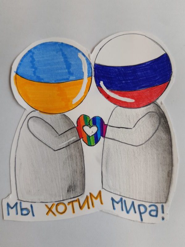 SAN BENEDETTO DEL TRONTO – Due sagome, una coi colori della bandiera ucraina una con quelli della federazione russa, che si stringono la mano a formare un cuore con l’arcobaleno della pace. Sotto uno speranzoso “Vogliamo la pace” in caratteri cirillici.