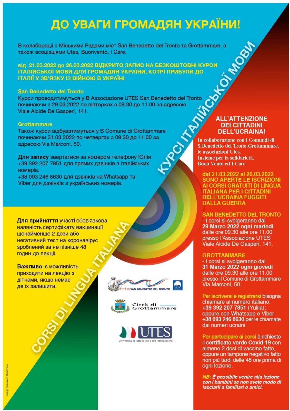 SAN BENEDETTO DEL TRONTO – I Comuni di San Benedetto del Tronto e Grottammare sostengono l’iniziativa promossa dalle associazioni Università di Tutte le Età e del Tempo Libero – UTES, Buon Vento, I Care e Insieme per la Solidarietà che organizzano una serie di corsi di lingua italiana gratuiti per i cittadini dell’Ucraina fuggiti dalla guerra.