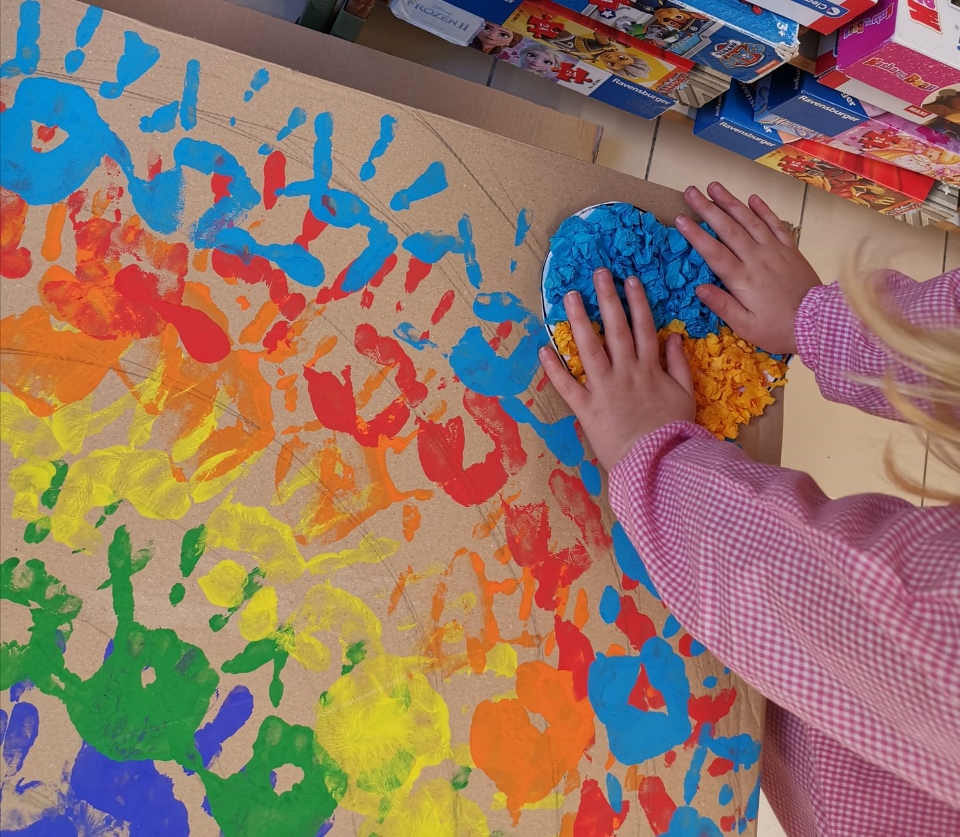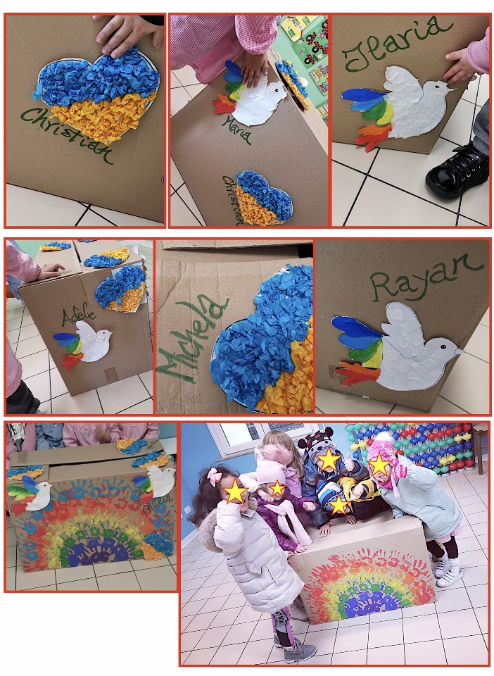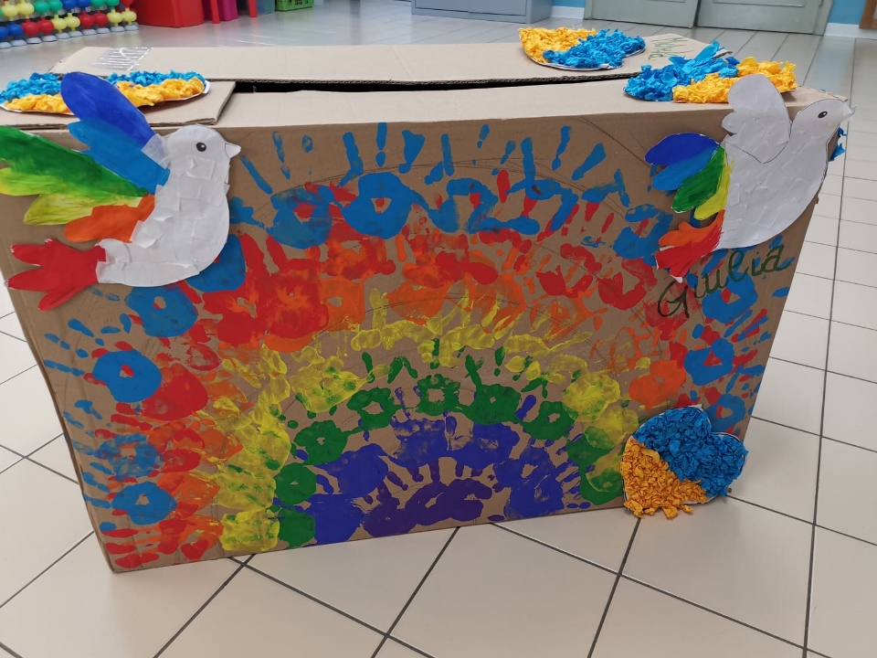 ” LA SCATOLA DELLA PACE”, dove ciascun bimbo/a ha lasciato la sua ” traccia artistica”: dalle impronte delle proprie mani, per realizzare un coloratissimo arcobaleno, simbolo di Alleanza, alla realizzazione di colombe della pace, fino alle decorazioni di cuori con i colori della bandiera Ucraina. “Per l’insegnamento dell’educazione civica rivolta alla scuola d’infanzia sono ammessi metodi basati sul gioco, ma anche attività educative e divertenti, in modo da capire e rispettare le differenze, scoprire le affinità e acquisire concetti come benessere e salute”