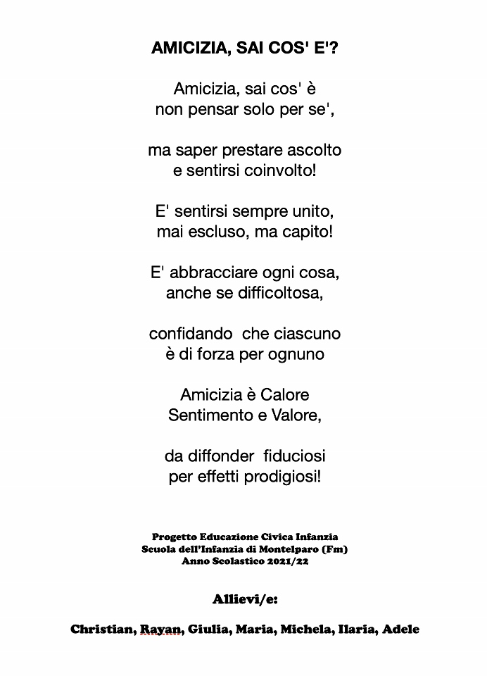 che per i Bambini/e dell’Infanzia ha la valenza di fondersi nell’AMICIZIA.