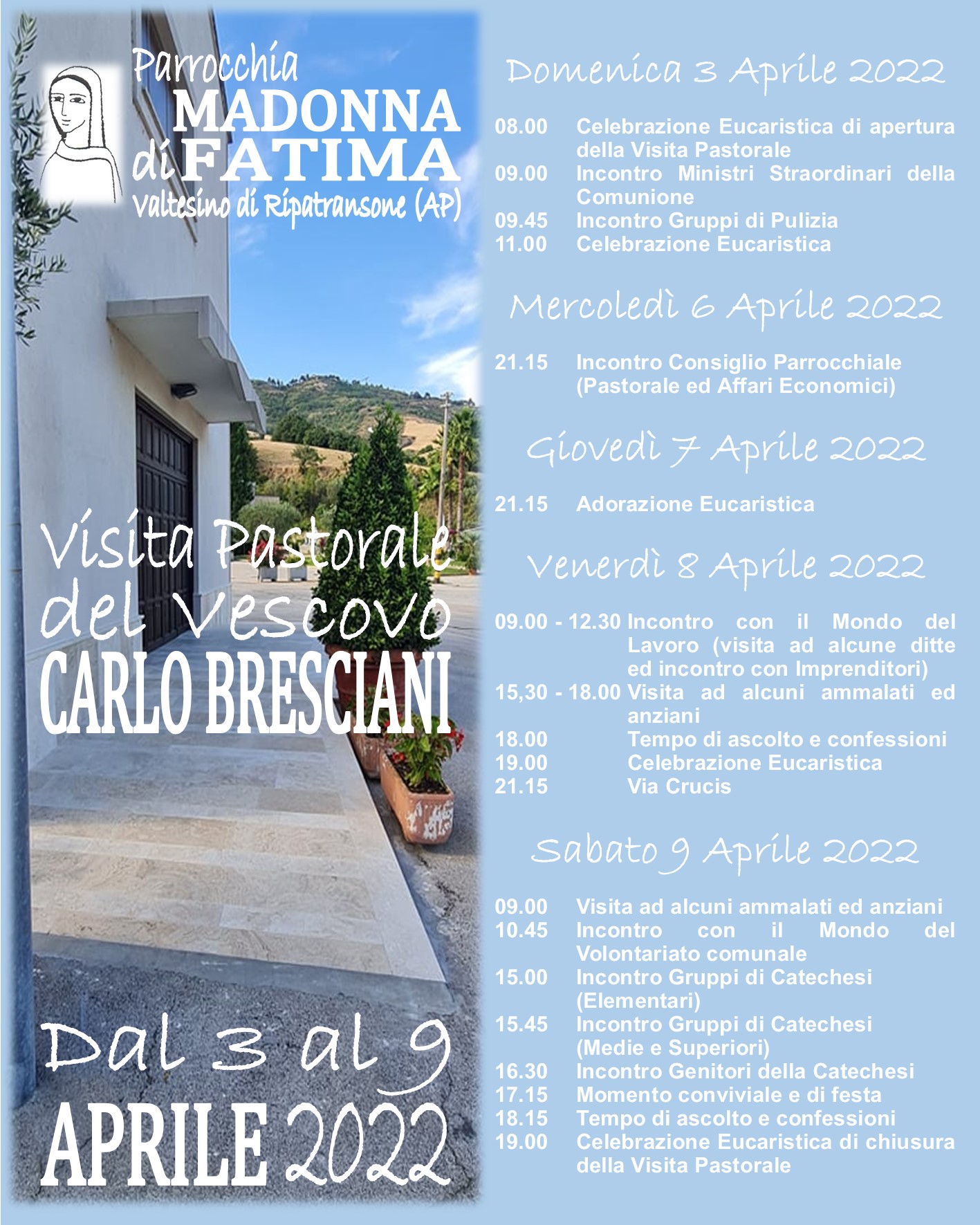 Mons. Bresciani farà tappa in Valtesino, nel cammino della sua Visita Pastorale che sta percorrendo nella Vicaria “Madonna di San Giovanni”, nei giorni dal 3 al 9 Aprile 2022. Saranno giorni sicuramente carichi di impegni in cui il Vescovo presiederà anzitutto alcune delle Celebrazioni previste in Parrocchia ma non mancheranno momenti particolari di incontro con le varie realtà che caratterizzano la Comunità, con chi in essa vive e lavora, in cui sarà possibile ascoltarsi, in cui egli sarà a disposizione per ascoltare le domande, i dubbi, le fatiche ma anche le gioie delle persone che egli incontrerà in Valtesino, persone che lo attendono così come dei figli attendono la visita di un padre ma anche come degli amici attendono l’arrivo di un amico speciale.