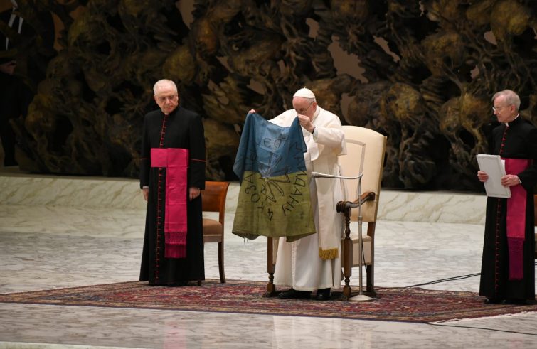 “Le recenti notizie sulla guerra in Ucraina, anziché portare sollievo e speranza, attestano invece nuove atrocità, come il massacro di di Bucha”. A denunciarlo è stato il Papa, al termine dell’udienza di oggi, prima dei saluti in lingua italiana. “Crudeltà sempre più orrende compiute anche contro civili, donne e bambini inermi”, ha proseguito Francesco: “Sono vittime il cui sangue innocente grida fino al cielo e implora: si metta fine a questa guerra, si facciano tacere le armi, si smetta di seminare morte e distruzione”. “Preghiamo insieme su questo”, l’invito del Papa ai presenti in Aula Paolo VI, che hanno pregato insieme a lui qualche minuto in silenzio. “E ieri, proprio da Bucha, mi hanno portato questa bandiera”, ha rivelato Francesco, che si è alzato in piedi per dispiegarla e farla vedere a tutti. “Questa bandiera viene dalla guerra. Proprio da quella città martoriata, Bucha”, ha spiegato: “E anche qui ci sono qui alcuni bambini ucraini che ci accompagnano. Salutiamoli e preghiamo insieme con loro”.