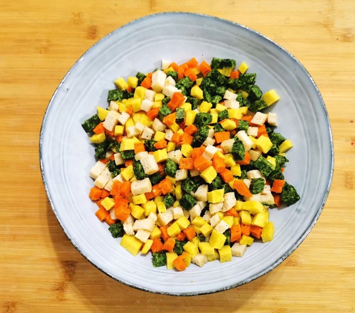 Una volta preparato il brodo di gallina, iniziare a preparare l’impasto sbattendo le uova con tutti gli altri ingredienti. A parte portare a bollore gli spinaci, ed una volta lessati, schiacciarli poi frullarli. Quando l’impasto è pronto, dividerlo in tre parti dove in una viene aggiunti gli spinaci lessati, nella seconda il pomodoro e nella terza rimane il colore delle uova. Osservando bene i tre composti, avremo una cromia che spazia dal verde all’arancione e al giallo. Come dice la tradizione, inserire tutte e tre le parti dell’impasto in un sacco di cotone chiudendo con lo spago e facendo cuocere in acqua bollente per circa 3 ore. 5.Una volta cotto, tirar fuori il sacco di cotone della pentola lasciandolo raffreddare senza aprirlo, e a raffreddatura avvenuta togliere l’impasto dal sacco di cotone e tagliarlo a dadini.