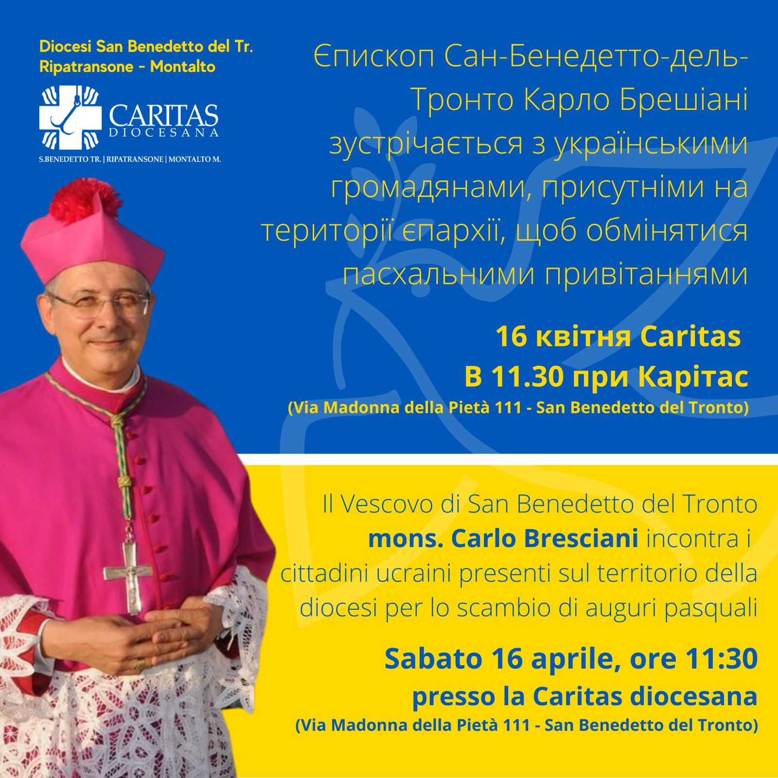 DIOCESI – Sabato 16 aprile alle ore 11,30, presso la Caritas Diocesana, il Vescovo Carlo Bresciani incontrerà i cittadini ucraini presenti nel territorio della Diocesi per lo scambio degli auguri pasquali.