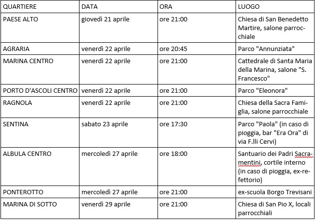 SAN BENEDETTO DEL TRONTO – I quartieri Agraria, Albula Centro, Marina Centro, Marina Di Sotto, Paese Alto, Ponterotto, Porto D’Ascoli Centro, Ragnola e Sentina apriranno nella prossima settimane, tra mercoledì 20 e venerdì 22 aprile, il ciclo di assemblee dei residenti che dovranno definire le modalità con cui i cittadini esprimeranno il loro voto per il rinnovo dei Consigli direttivi previsto per il 4 e 5 giugno 2022.