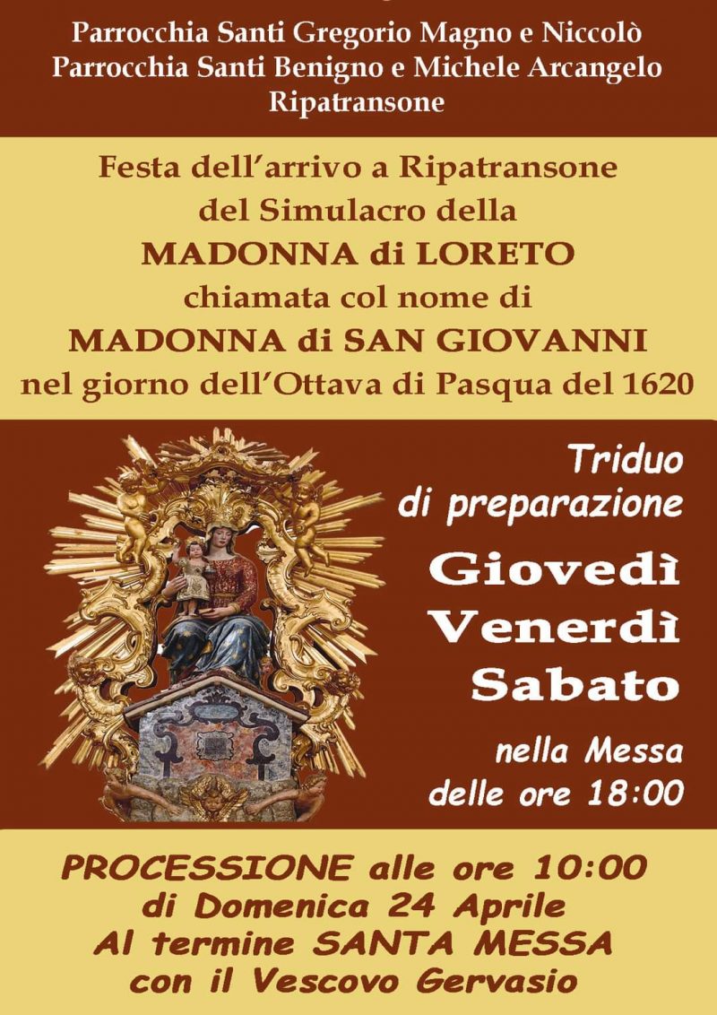 RIPATRANSONE – A Ripatransone si celebra la Festa dell’Ottava di Pasqua, Solenne Festività in onore della Madonna di San Giovanni, della Diocesi. Il Triduo di preparazione è iniziato giovedì 21 aprile per proseguire nei giorni di venerdì e sabato, con la celebrazione della Santa messa in Duomo alle ore 18. Domenica 24 aprile si terrà, a partire dalle ore 10,00, la processione. Al termine Santa Messa presieduta dal Vescovo emerito Gervasio Gestori si terrà la benedizione del Cavallo di Fuoco.