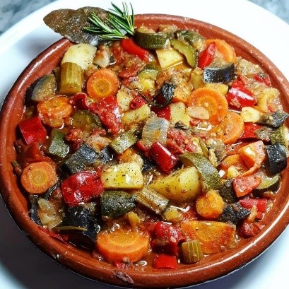 Lavare e tagliare a pezzetti (più o meno uguali) le zucchine, le cipolle, le patate, i peperoni e la melanzana. In una padella capiente far imbiondire l’aglio in olio. Aggiungere tutte le verdure tagliate e mescolare bene a fuoco vivace per 6/7 minuti. Abbassare il fuoco e coprire con il coperchio. Far cuocere per circa 15/20 minuti. Nel frattempo spellare i pomodori e tagliarli a pezzi. Passate i 20 minuti aggiungere i pomodori, mescolare, coprire ancora e lasciar cuocere altri 10/15 minuti.