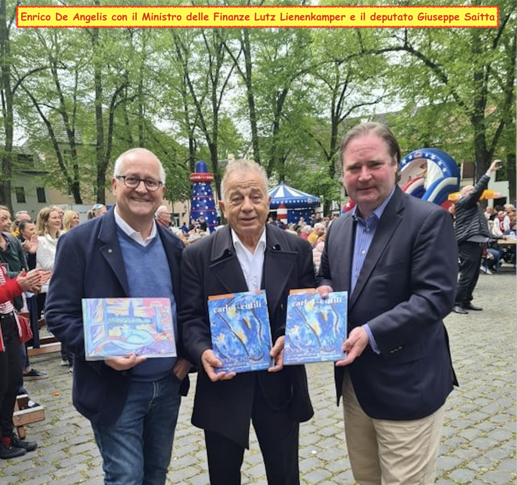 “Si è trattato di un grande evento di presentazione avvenuto sia all’interno del nostro locale che all’esterno nei luoghi del festeggiamento della Renania. I colori di Carlo Gentili sono stati molto apprezzati dal pubblico tedesco”. Con queste parole il cav. Enrico De Angelis ha sintetizzato la presentazione del volume “Diarmonia” di Carlo Gentili a Düsseldorf, città della Renania, nota per il turismo, l’arte, la cultura. Il primo maggio è avvenuta la presentazione del libro alle autorità regionali e nazionali. Nella foto il cavalier De Angelis consegna il libro “Diarmonia” al ministro delle finanze della regione della Renania Lutz Lienenkamper. Altre personalità erano presenti all’iniziativa come la deputata Angela Erwin, il deputato Giuseppe Saitta e tante signore presenti all’interno del locale del prestigioso ristorante “Saltimbocca” dello stesso De Angelis.