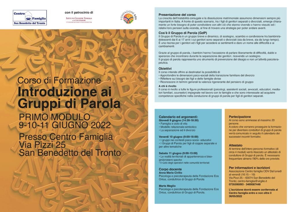 SAN BENEDETTO DEL TRONTO – Centro Famiglia organizza il Corso di formazione “Introduzione ai gruppi di parola” con il patrocinio dell’Istituto Giuseppe Toniolo di Studi Superiori e la Fondazione EOS il 9-10-11 giugno 2022 presso la sede di San Benedetto del Tronto, via Pizzi,25.