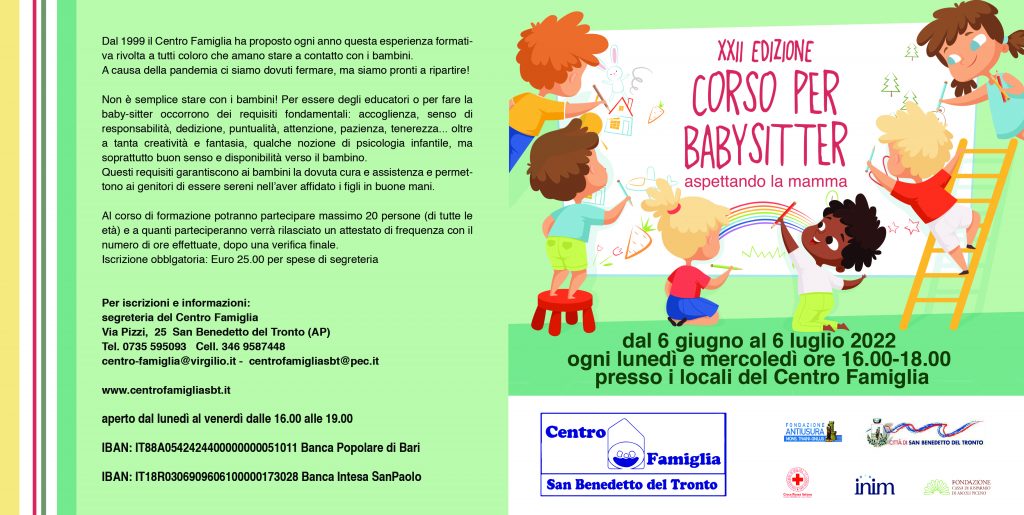 SAN BENEDETTO DEL TRONTO – Quest’anno il Centro Famiglia dopo due anni di pandemia, ripropone il corso per baby-sitter, giunto alla sua XXII Edizione.