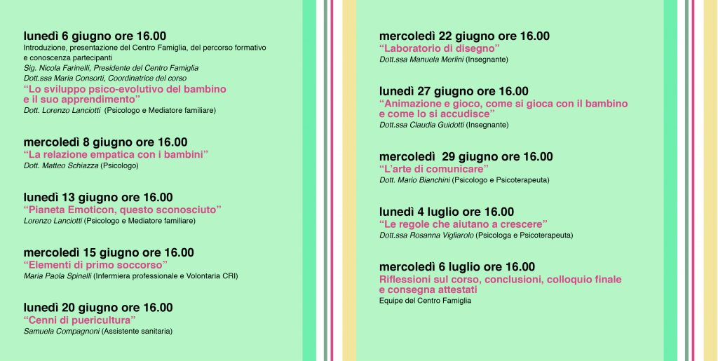 Per info e iscrizioni, si invita a contattare la segreteria del Centro Famiglia aperta dal lunedì al venerdì dalle 16.00 alle 19.00