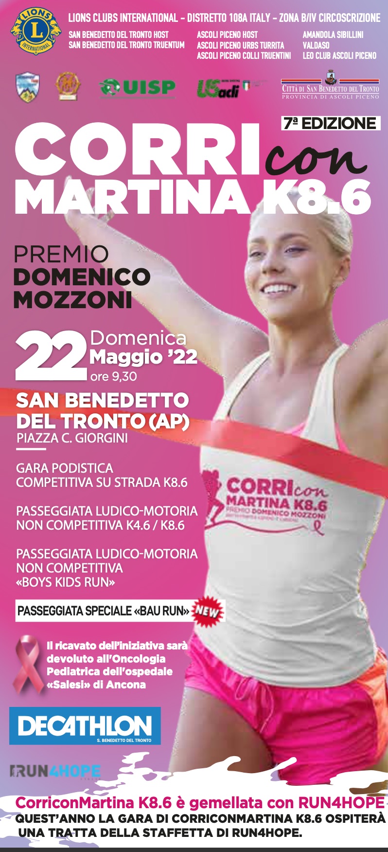 SAN BENEDETTO DEL TRONTO – Mancano due giorni allo svolgimento della settima edizione di “Corri con Martina K 8.6 – – Premio Domenico Mozzoni”, un evento dedicato a tutti, non solo agli sportivi, ma anche a chi vorrà camminare, indossando la T-Shirt Tecnica da collezione, che si potrà avere con l’iscrizione di 10 euro negli stand posizionati in Piazza Giorgini.