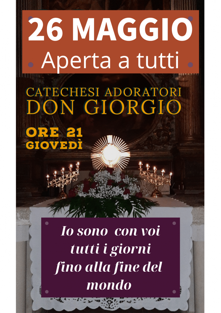 Per questo, la nostra Gioia alla presenza del Signore Gesù nell’Eucarestia, vogliamo condividerla, invitandovi a questo momento insieme, di riflessione, nella Catechesi con Don Giorgio Carini. Approfondiremo il Grande Dono dell’Eucarestia e vi invitiamo già da ora, ad unirvi a noi, nell’Adorazione Eucaristica Perpetua per rispondere a Colui che ci ha amato per primi.