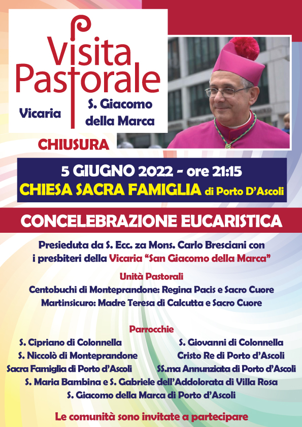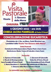 DIOCESI – Domenica 5 giugno alle ore 21.15 nella Chiesa della Sacra Famiglia a Porto d’Ascoli verrà celebrata la Santa Messa per la conclusione della visita pastorale di S.E.R Mons. Carlo Bresciani nella Vicaria di San Giacomo della Marca.