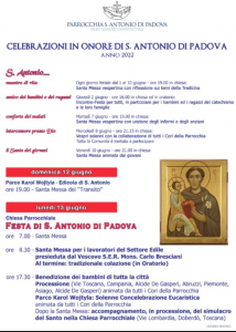 Domenica 12 giugno alle ore 19.00, presso il parco Karol Wojtyla – Edicola di sant’Antonio, sarà celebrata la santa Messa del “transito”.