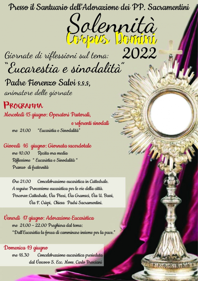 mercoledì 15 giugno alle 21.00 incontro “Eucaristia e sinodalità” rivolto agli operatori pastorali e referenti sinodali, mentre giovedì 16 si terrà la Giornata sacerdotale a partire dalle 10 con “Recita ora media” per proseguire con una momento di riflessione su “Eucaristia e sinodalità” e pranzo di fraternità. Sempre giovedì, ma alle 21, si terrà la Concelebrazione eucaristica in Cattedrale. A seguire Processione eucaristica per le vie della città, così come previsto dal percorso: Cattedrale, via Pizzi, via Gramsci, via U. Bassi, via Crispi, Chiesa Padri Sacramentini. Venerdì 17 giugno dalle 21 alle 22 si terrà l’Adorazione Eucaristica e preghiera dal tema “Dall’Eucaristia la forza di camminare insieme per la pace”.