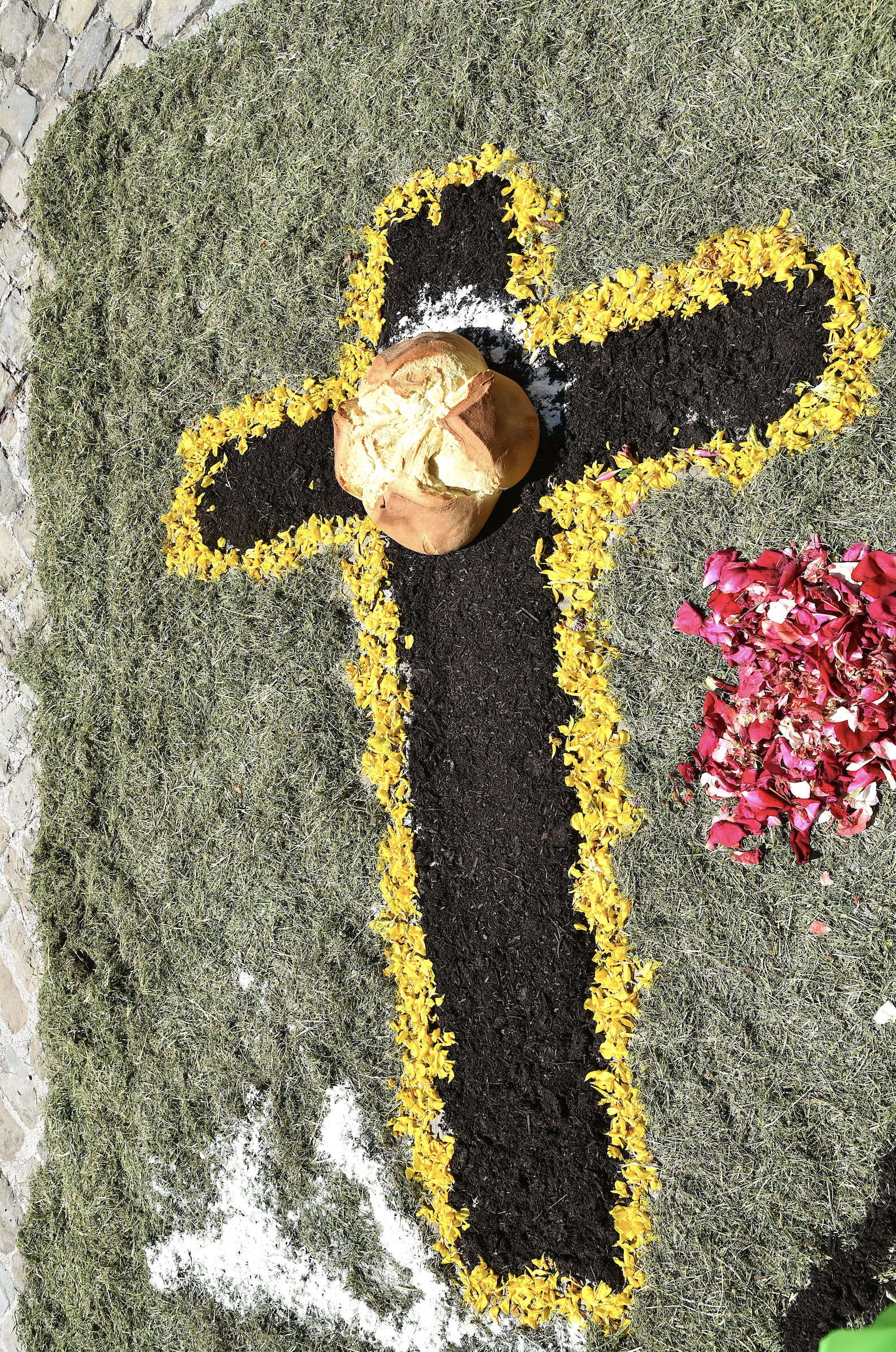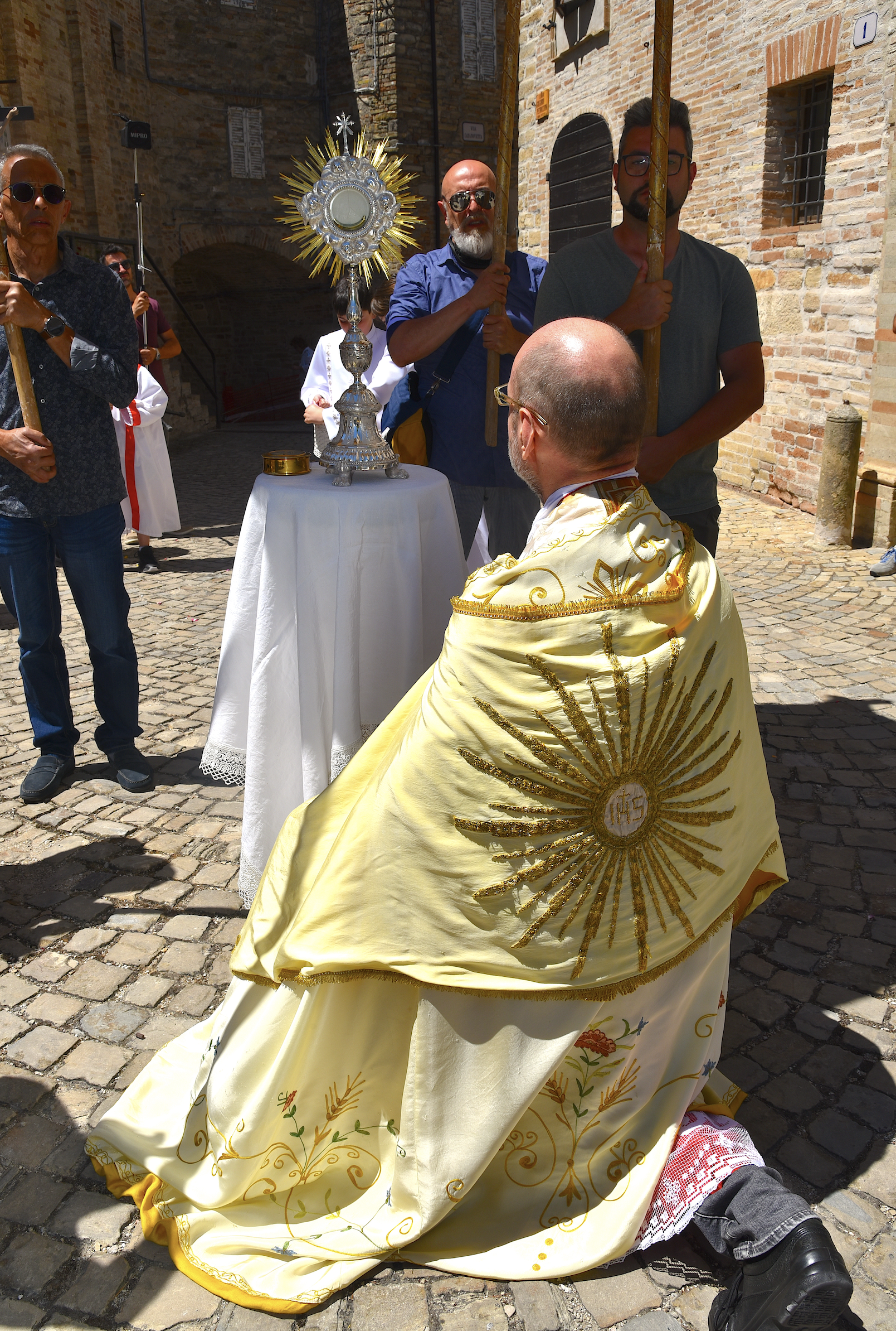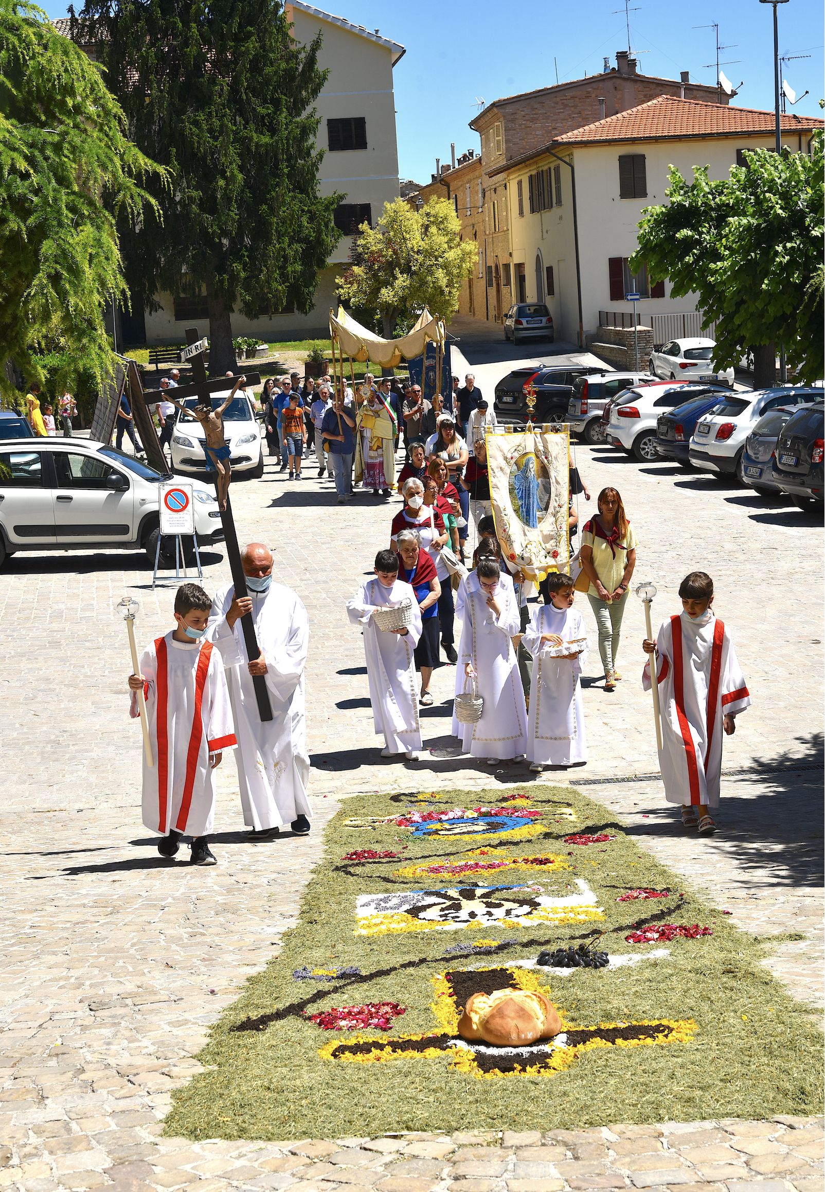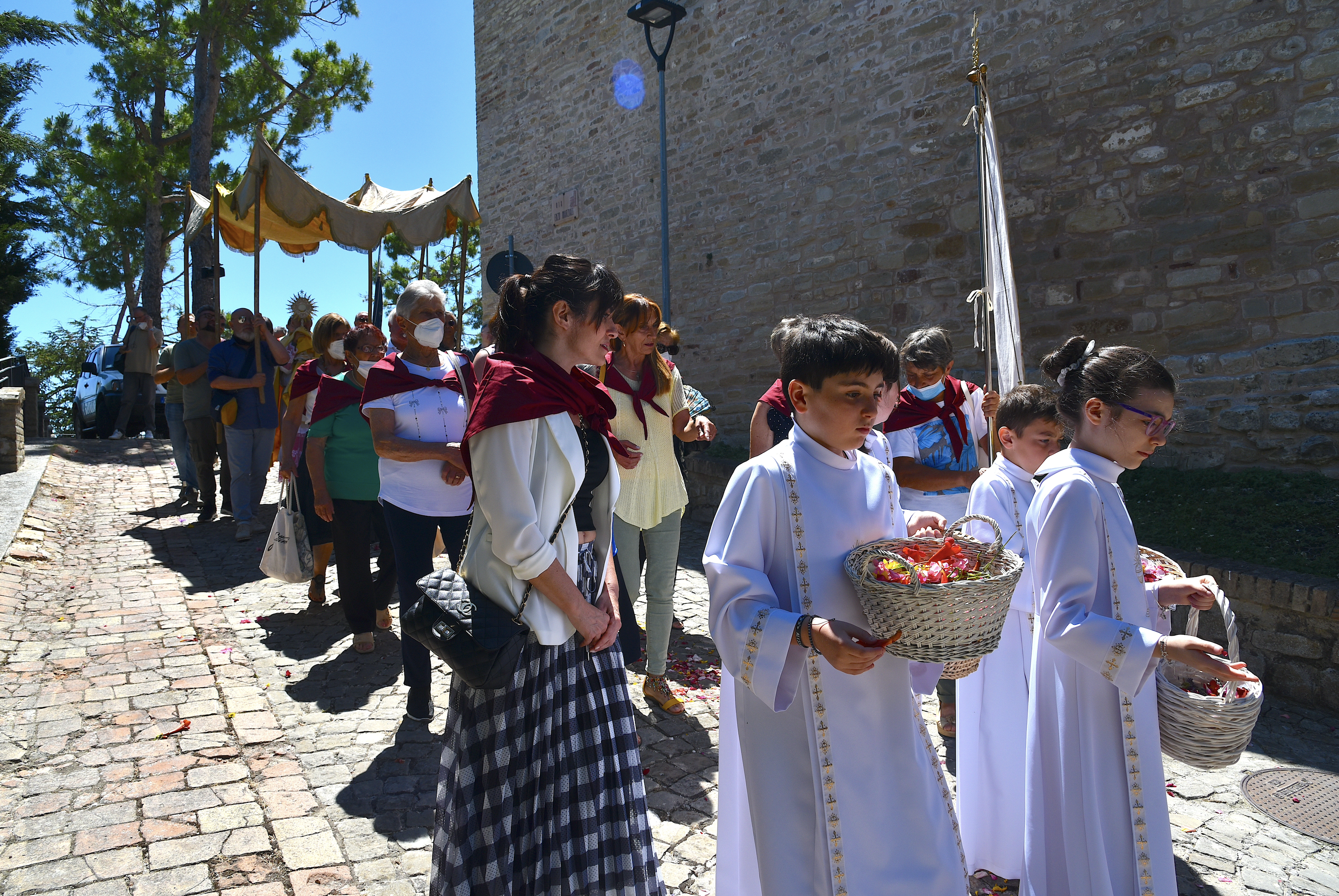 Al termine della Santa Messa una solenne processione ha portato il Santissimo, che era nelle mani del Priore protetto dallo storico baldacchino dorato, dalla Chiesa di San Michele Arcangelo a quella dei Santi Pietro e Silvestro dopo aver attraversato tantissime vie del paese. Bellissimi i molti luoghi che erano stati infiorati e decorati fin dalle primissime ore del mattino. Durante il percorso i bambini lanciavano in aria i petali di fiori variopinti contenuti in ceste colme e profumate!