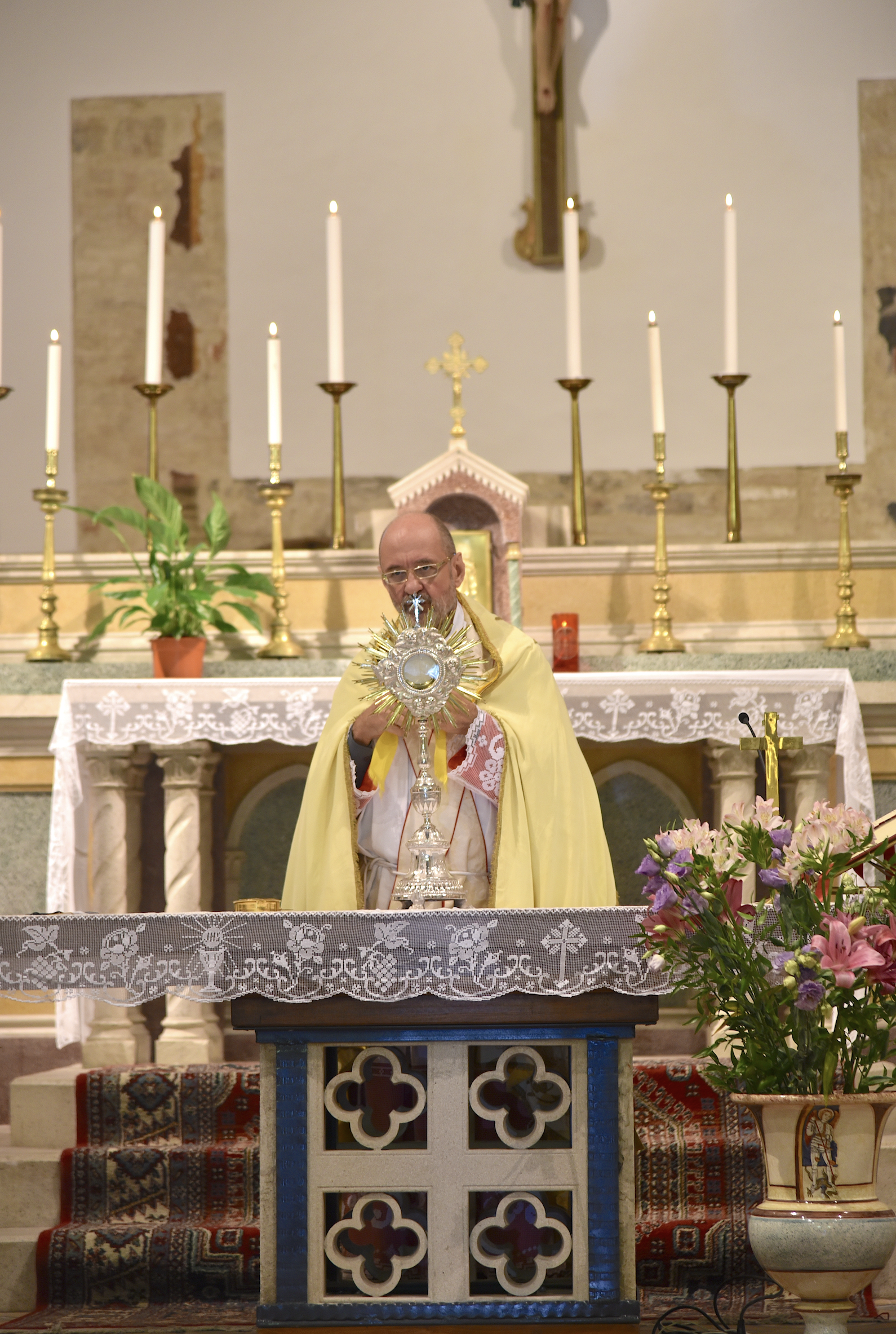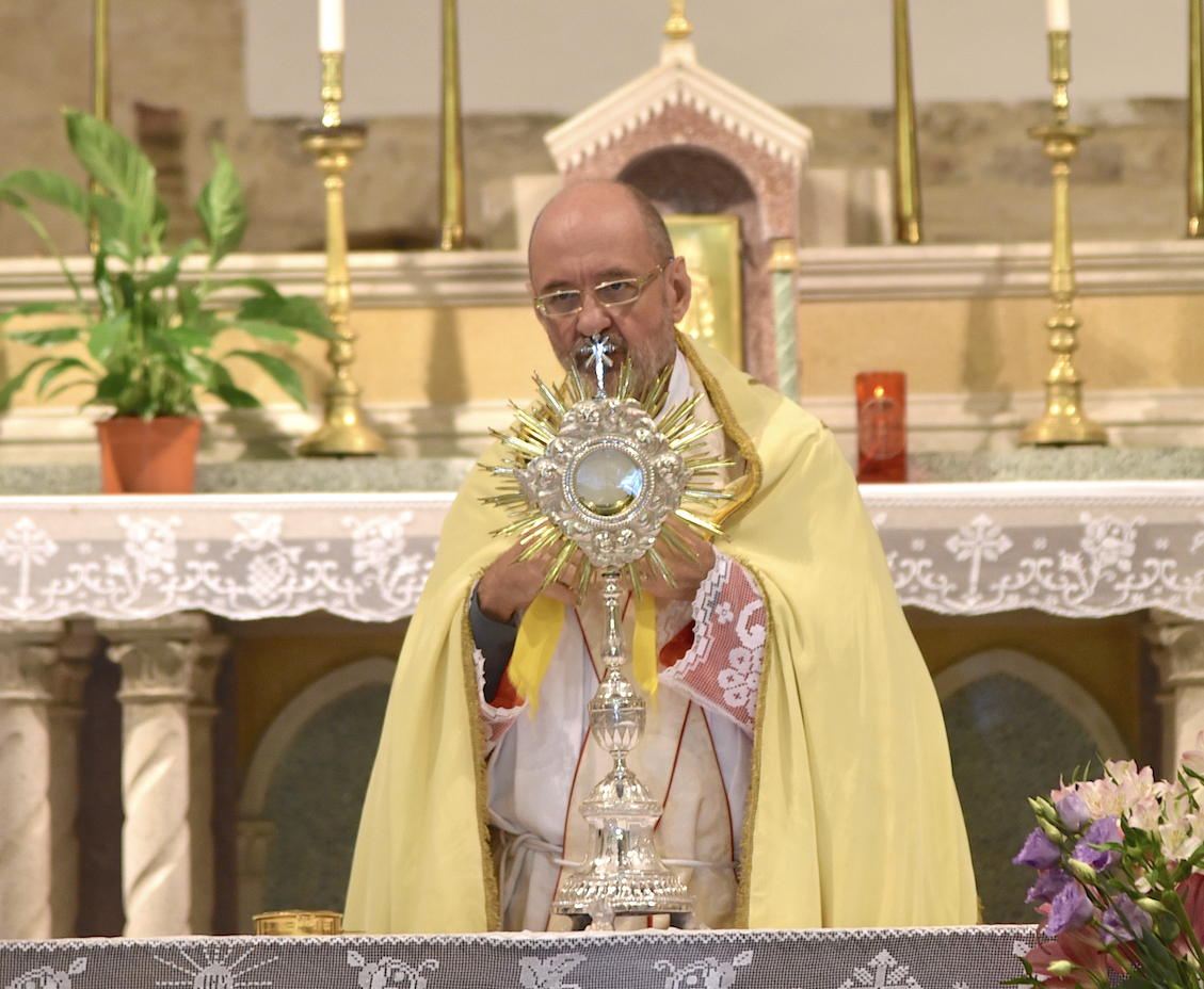 Erano presenti, anche oggi nella loro veste candida, i bambini che il 5 giugno scorso avevano ricevuto il Sacramento della Prima Comunione (Alessandro, Clara Michela, Leonardo e Serena)! Nell’omelia da lui pronunziata, durante la cerimonia, ha dato ancora una volta un saggio dell’efficacia della sua parola (quasi una lezione di teologia, alla numerosa, silenziosa e attenta folla di fedeli presente, sul mistero della presenza del Corpo di Cristo nell’ostia consacrata!). Rilevando, per l’occasione, il fondamentale ruolo che il Sacramento dell’Eucarestia riveste (o dovrebbe rivestire) nella vita dei Cattolici e dei credenti, ha esortato con energia a nutrirsi con continuità di quel bene prezioso che il Cristo ci ha lasciato sacrificando se stesso sulla croce: il proprio corpo nella sostanza del pane! Ha inoltre esortato i fedeli alla condivisione con i propri simili ricordando il miracolo del Cristo nella moltiplicazione dei pani e dei pesci!