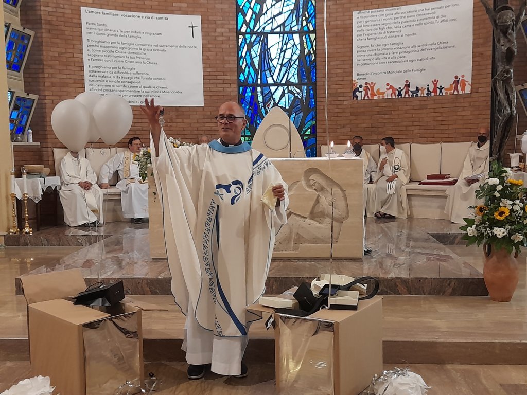 Prima della benedizione, Emanuela Lardani, segretaria del Consiglio Pastorale Parrocchiale, ha preso la parola per fare gli auguri a don Alfredo a nome di tutta la comunità dell’Annunziata: “Carissimo Don Alfredo, è con immenso piacere che oggi siamo qui riuniti per gioire con te in occasione del venticinquesimo anniversario della tua ordinazione sacerdotale, un evento che porta speranza e luce nuova a tutta la comunità. Ti esprimiamo la nostra felicità per questi ultimi tre anni trascorsi insieme, anni che ti hanno portato a questa bella tappa, anni che sono stati particolarmente impegnativi per tutti: la pandemia, infatti, ha messo a dura prova certezze, priorità, desideri e sogni, ma l’affetto, l’amore e la fede non mutano. Anzi! Abbiamo cercato, col tuo aiuto, di volerci ancora più bene, sull’esempio dell’amore di Cristo crocifisso. È su questo amore che stasera vogliamo radicare il nostro augurio per te. Caro Don Alfredo, ti auguriamo di non avere mai paura, di essere profeta di Speranza, annunciatore di Verità, ministro di Grazia, servitore della Vita, che tu possa sempre sentire il sacerdozio come un grande dono di Dio per la costruzione della vera civiltà, quella dell’amore. Ti affidiamo alla Vergine Annunziata che non ti farà mai mancare la sua dolce e tenera presenza, ma sappi anche che questa comunità ti sostiene e ti è vicina. E, se il carico si facesse pesante, arriveremo in soccorso, come stasera con questi validi e forti corrieri che ci aiutano a consegnarti i nostri tanti e calorosi auguri!”