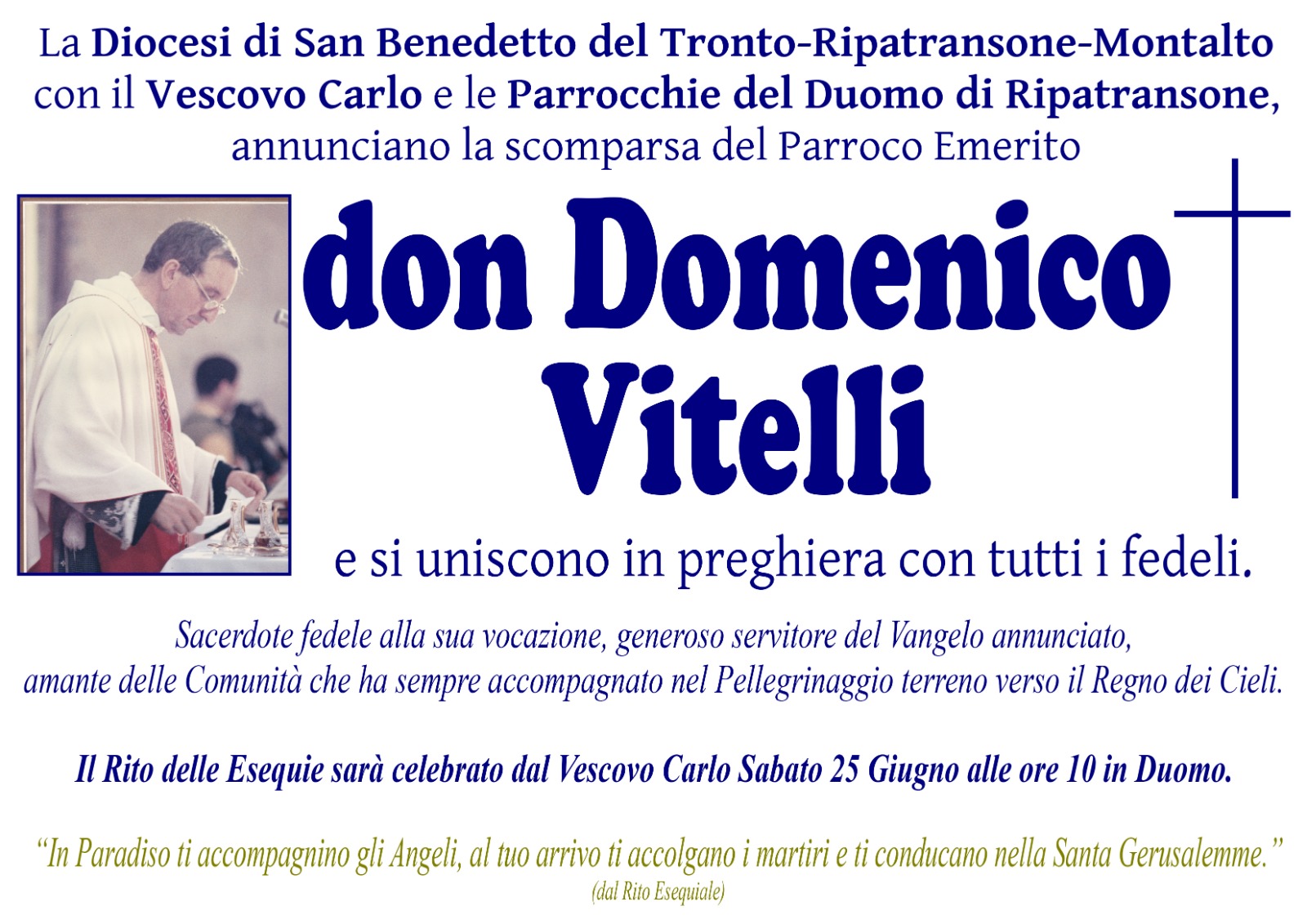 RIPATRANSONE – Sabato 25 giugno, alle ore 10.00 il Vescovo Carlo Bresciani, presidierà il rito delle esequie di Don Domenico Vitelli presso il Duomo di Ripatransone.