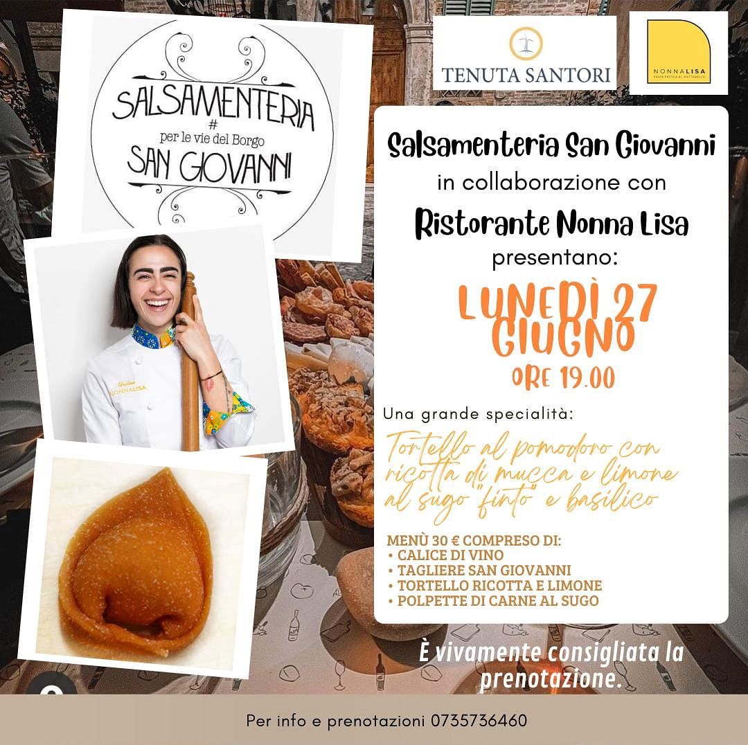 Il menu della serata sarà molto ricco, stando a quanto affermato dai due giovani: “Partiremo con il tagliere San Giovanni, un assaggio di salumi e formaggi del territorio, una specialità della nostra Salsamenteria. Proseguiremo poi con un primo sfizioso e gustoso, il tortello ricotta e limone, un piatto che coniuga la necessità del colore con l’esigenza di avere un prodotto tipico dal ripieno molto classico: l’impasto, infatti, è al concentrato di pomodoro e pertanto è di colore rosso, ma al suo interno contiene ricotta di mucca e limone. Questa è una specialità del Laboratorio Nonna Lisa. Infine porteremo in tavola il gusto classico e genuino delle polpette di carne al sugo che saranno la gioia sia dei grandi che dei piccini. I nostri piatti, colorati e gustosi, infatti, si rifanno alla tradizione culinaria locale e, al tmepo stesso, sono gradevoli alla vista, quindi particolarmente apprezzati anche dai bambini.”