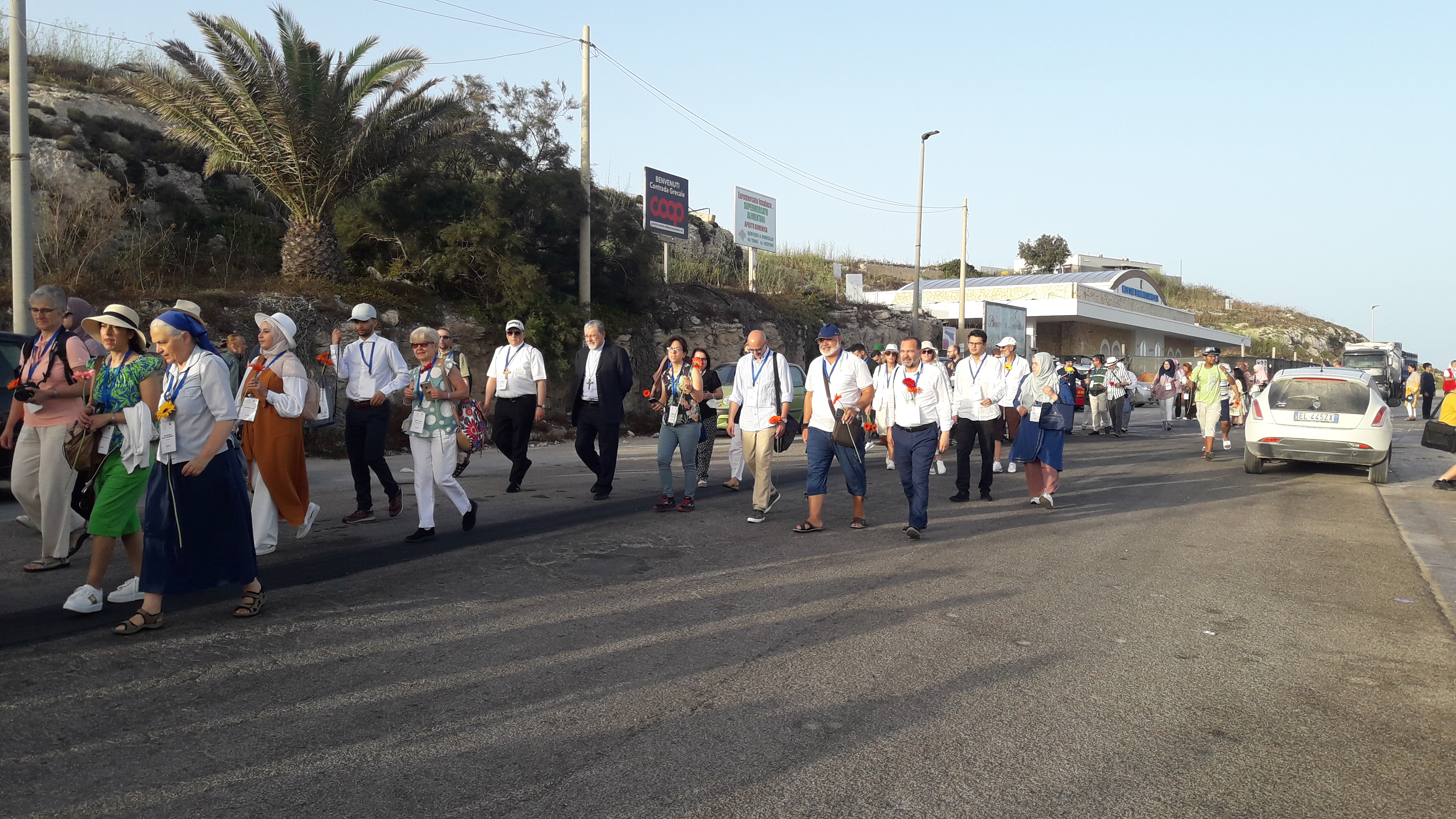 Un pellegrinaggio a piedi lungo l’isola di Lampedusa, sostando in silenzio e preghiera, nei luoghi simbolo della lotta della vita contro la morte. Cristiani e musulmani sono arrivati qui solcando il Mar Mediterraneo. Ad accompagnarli nelle varie tappe brani tratti dal Libro di Giona, il profeta riconosciuto da cattolici e musulmani, presente nella Bibbia e nel Corano e che secondo la narrazione biblica si trovò anche lui su una nave investita da un temporale con il rischio di colare a picco dalla violenza delle onde. “Sulla stessa barca”, è il titolo di questo incontro promosso dall’Ufficio Cei per l’ecumenismo e il dialogo interreligioso, insieme ai leader delle principali Comunità islamiche. Partiti ieri sera dal porto di Trapani, questa mattina all’alba i partecipanti sono sbarcati sull’isola con in mano una gerbera, simbolo di vita e relazione, ma anche un omaggio in memoria di tutti i migranti che hanno perso la vita sulla rotta di questo mare.