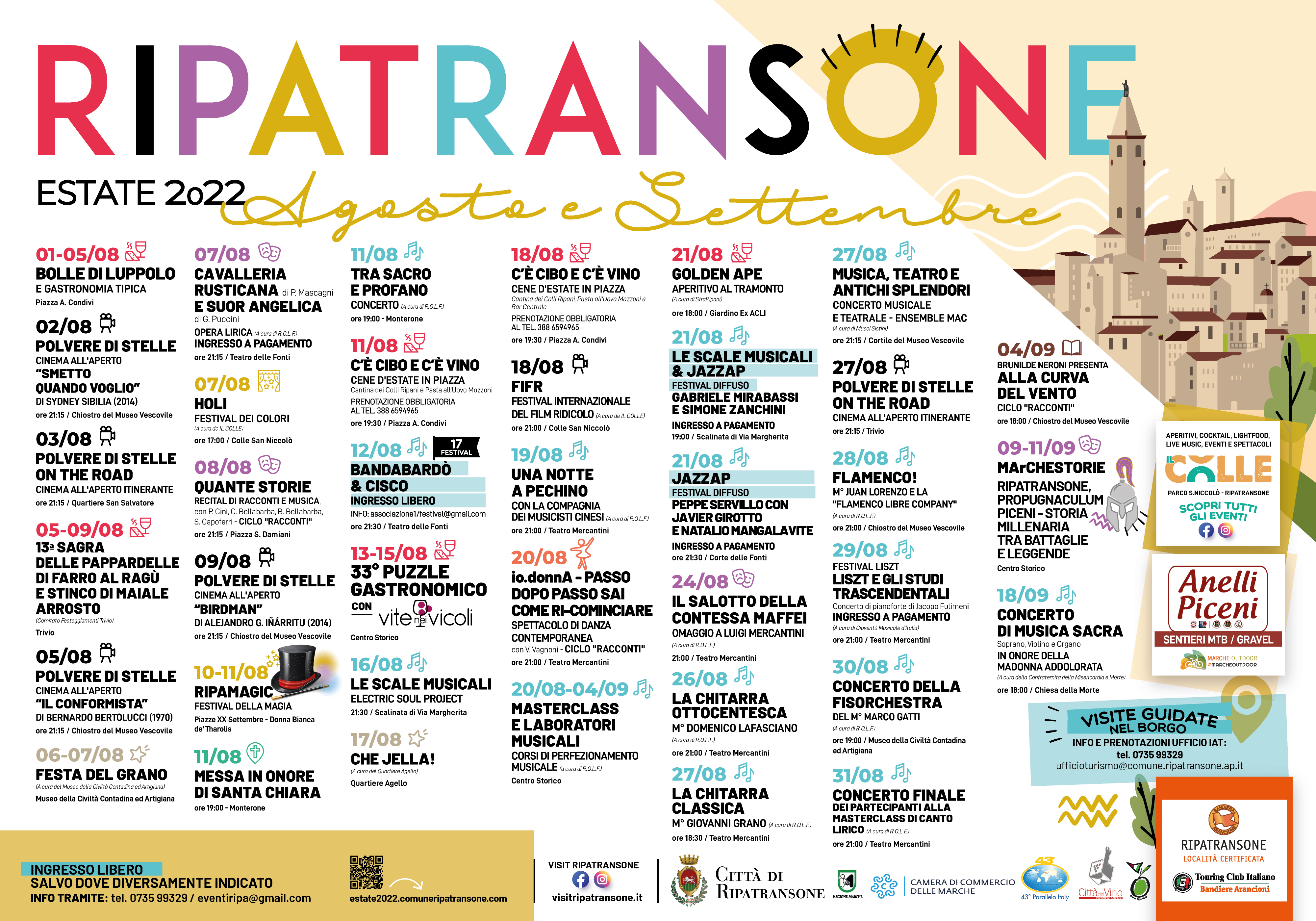 Musica, Teatro, Letteratura, Cinema, Tradizione, Enogastronomia, Sociale, Arte, Storia, Danza, Sport e Intrattenimento. Filoni su cui si svilupperanno le numerose iniziative che l’Amministrazione Comunale di Ripatransone, di concerto con le associazioni e le realtà ripane e del territorio, ha strutturato per offrire ai cittadini ed ai turisti un’esperienza completa di visita della Città e di intrattenimento attraverso una proposta culturale differenziata e di valore.