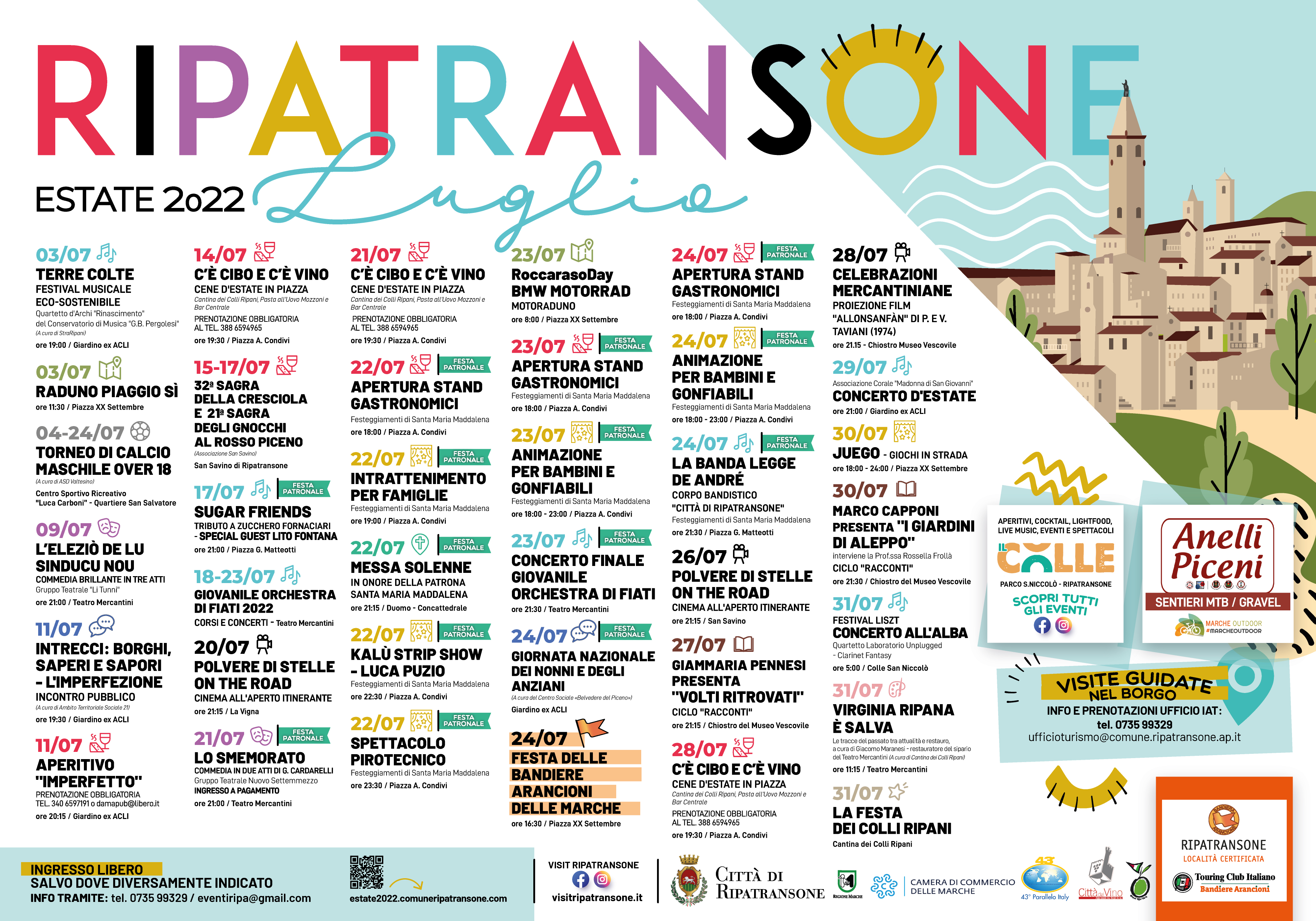 A Ripatransone si terrà inoltre la Festa delle Bandiere Arancioni delle Marche (24 luglio), l’evento che celebra l’entroterra di qualità con il marchio del Touring Club Italiano.