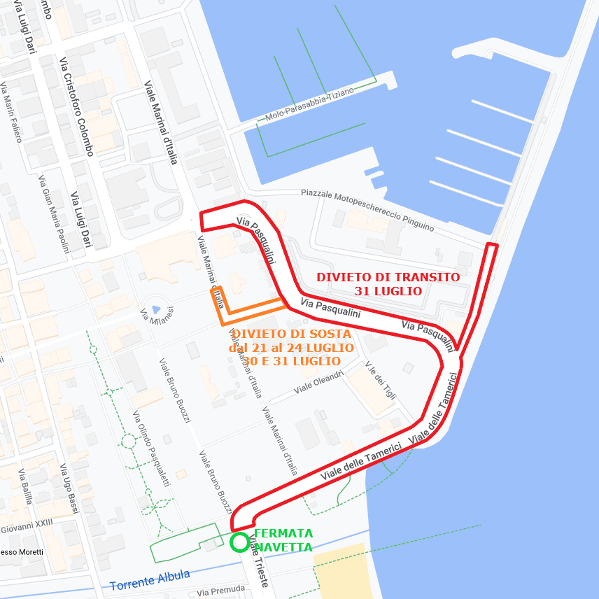 Tra giovedì 21 e domenica 24 luglio, e nei giorni di sabato 30 e domenica 31 luglio, nel tratto di viale Marinai d’Italia compreso tra via Milanesi e via Bruni e su via Bruni (in pratica, la viabilità circostante il faro) insisterà, dalle 18 fino a fine manifestazione, il divieto di sosta, ad eccezione dei mezzi autorizzati.