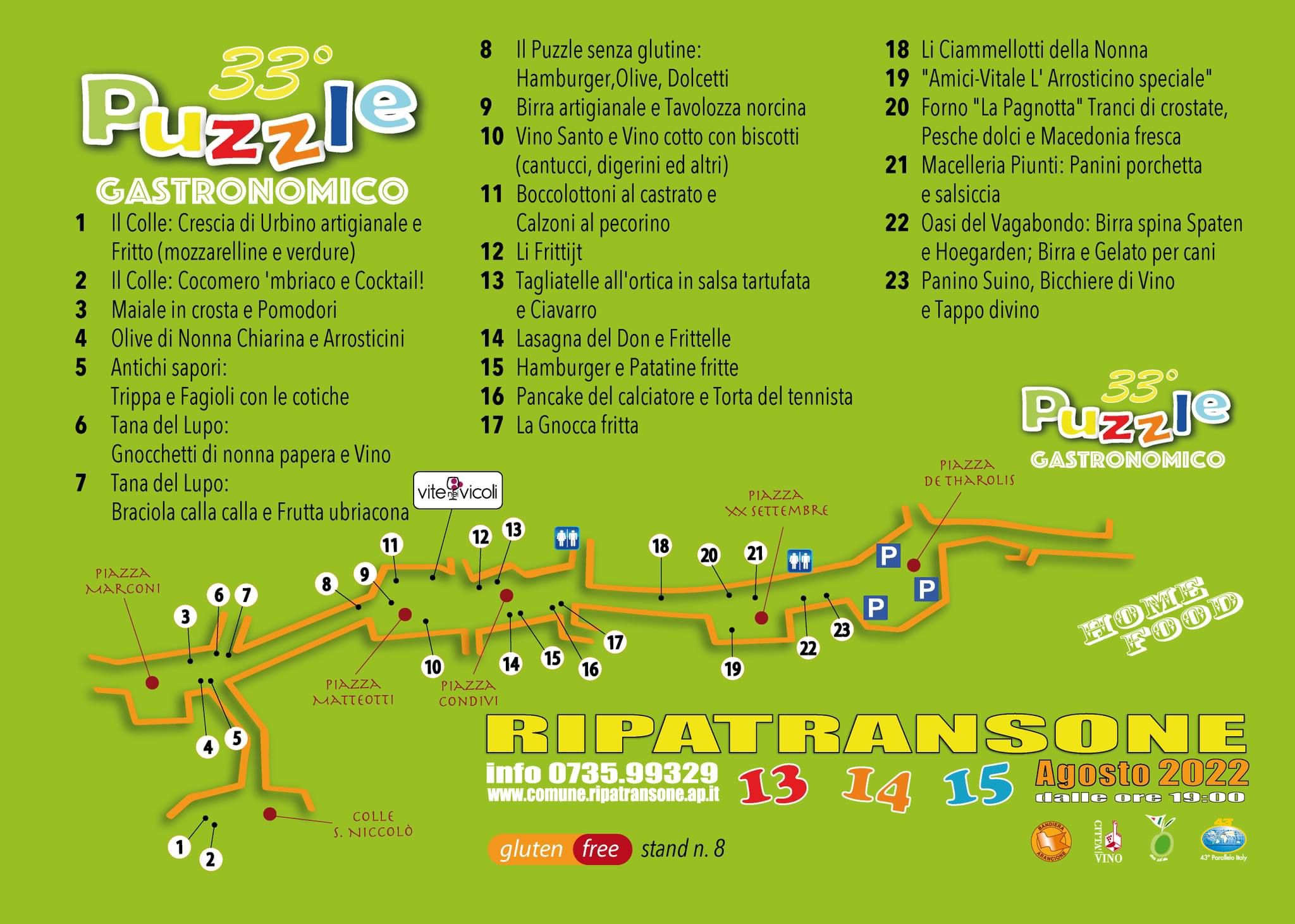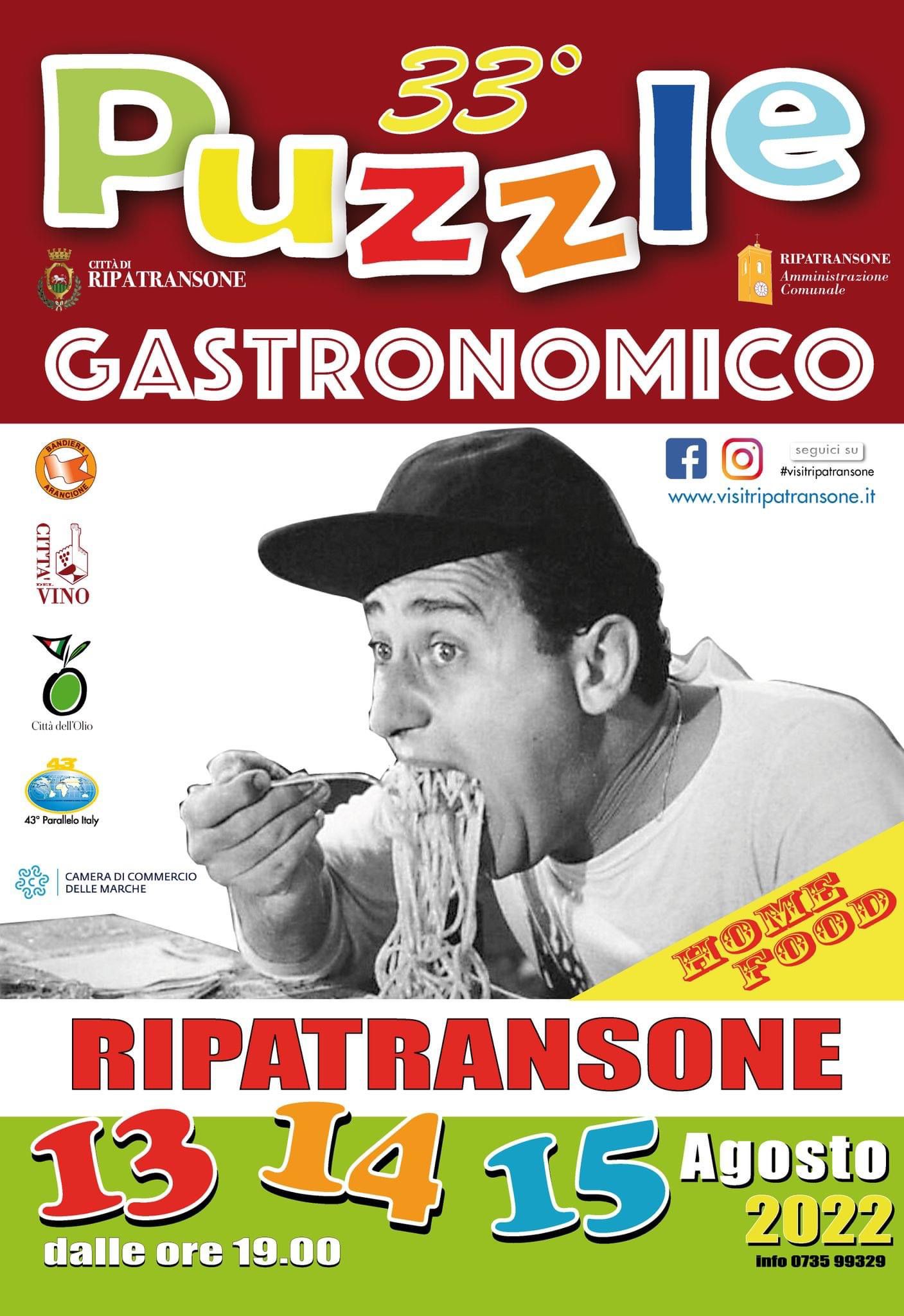 RIPATRANSONE – Dopo l’interruzione dovuta alla pandemia, torna l’immancabile Puzzle Gastronomico, la straordinaria manifestazione enogastronomica del Ferragosto di Ripatransone. Giunto alla sua 33ª Edizione, l’evento in programma nelle serate del 13, 14 e 15 agosto, farà immergere il Centro Storico del Belvedere del Piceno nella tradizione culinaria locale grazie all’operosità dei cittadini. Saranno gli stessi Ripani, infatti, i protagonisti dell’iniziativa: nei ben 23 stand curati da famiglie ed associazioni, piatti tipici, specialità ed il calore della stessa comunità che accoglierà il pubblico con il format dell’Home Food.