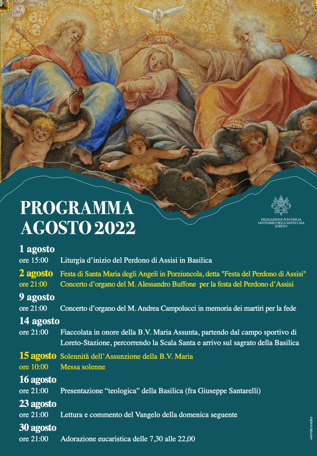 LORETO – La Delegazione Pontificia informa che, in occasione della solennità dell’Assunta, il programma religioso osserverà il seguente calendario.