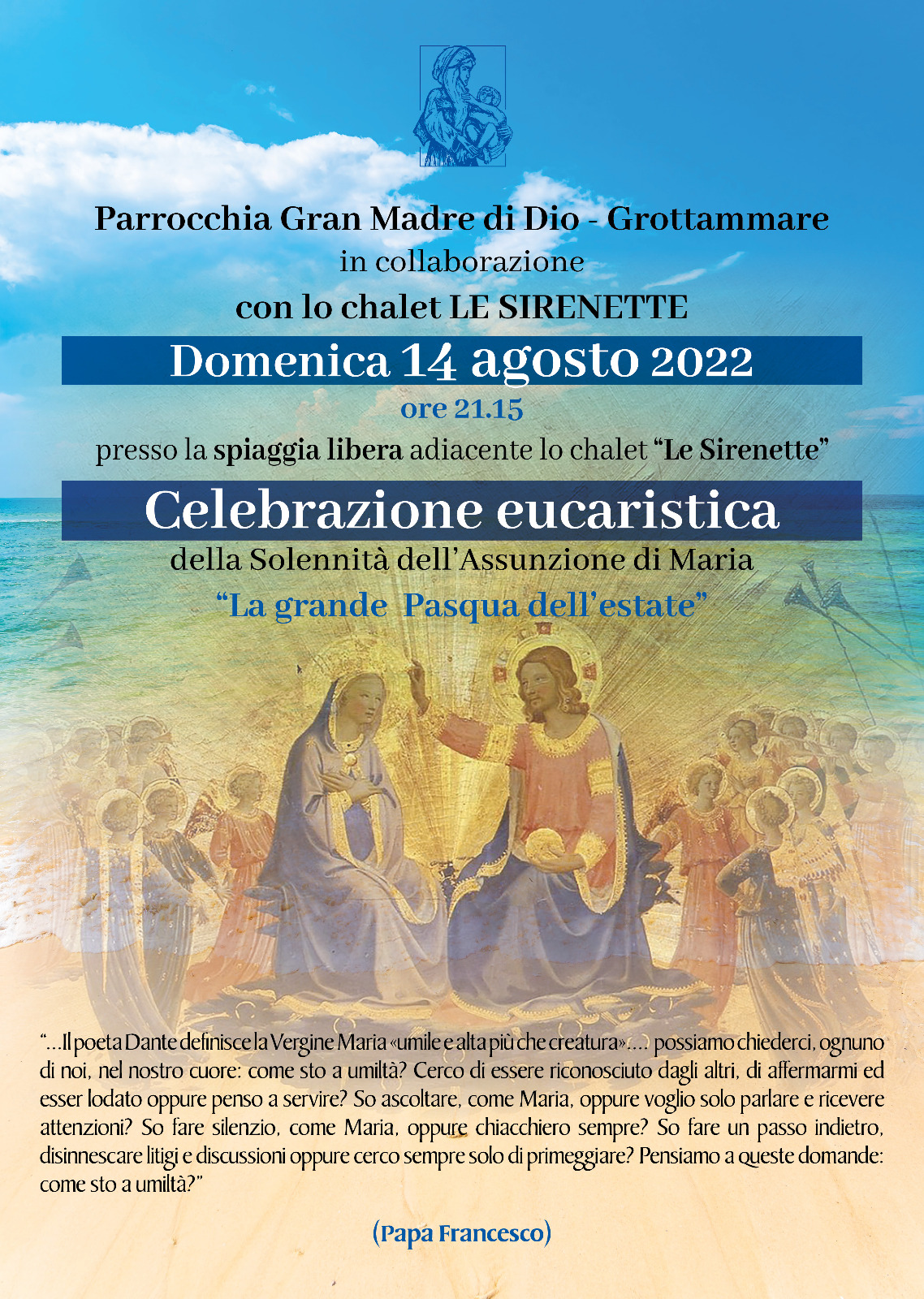 GROTTAMMARE – La Parrocchia Gran Madre di Dio di Grottammare, in collaborazione con lo chalet “Le Sirenette”, ha organizzato per stasera, 14 agosto, alle ore 21:15, presso la concessione n. 9, ovvero la spiaggia libera adiacente al lido, “La grande Pasqua dell’estate”, una celebrazione eucaristica in occasione della solennità dell’Assunzione di Maria.