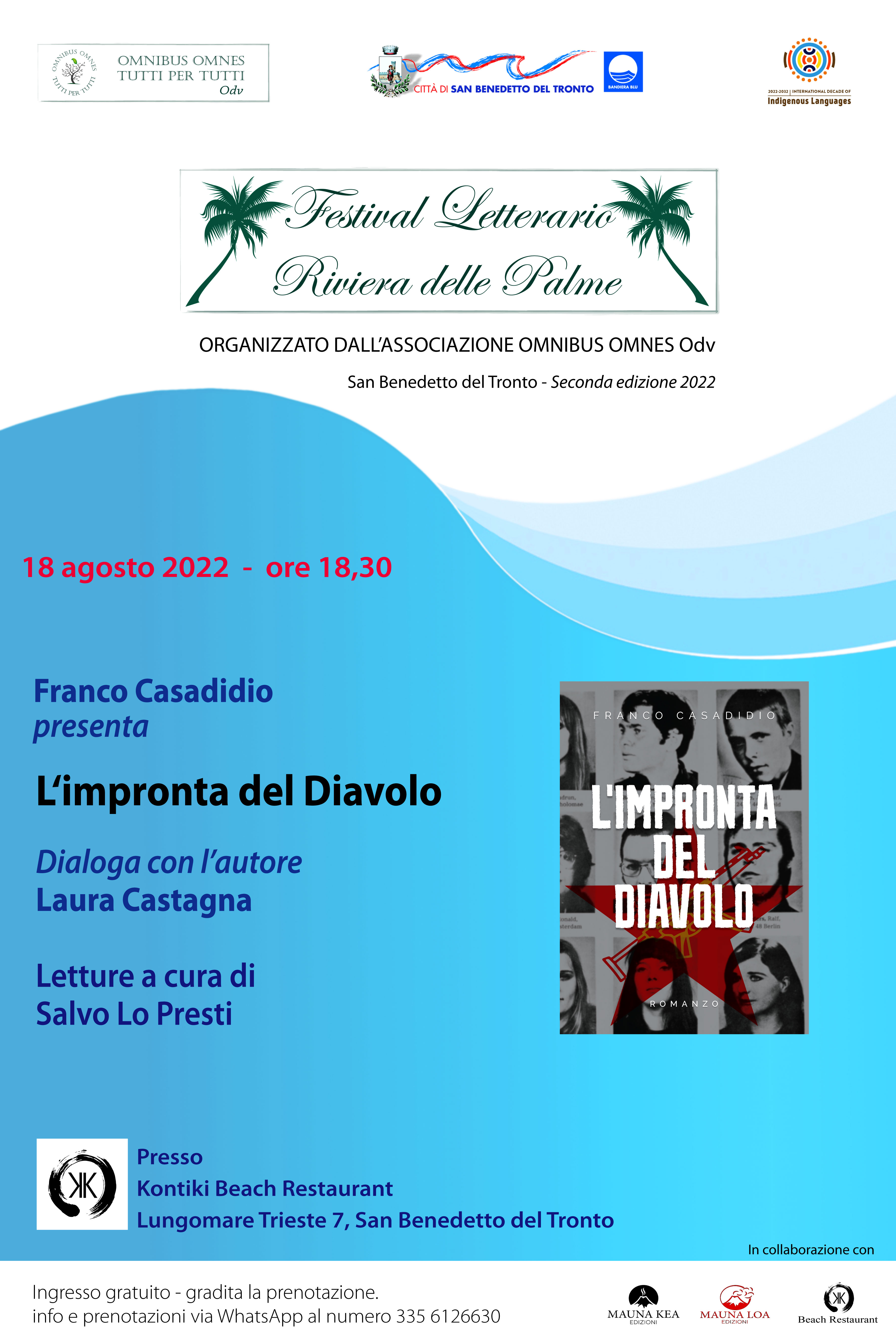 SAN BENEDETTO DEL TRONTO – Si terrà domani, giovedì 18 agosto, alle ore 18:30, presso lo Chalet Kontiki sul lungomare di San Benedetto del Tronto, il penultimo appuntamento dell’estate per il Festival Letterario Riviera delle Palme organizzato dalla Omnibus Omnes OdV, associazione sambenedettese. A presentare la sua appassionante fatica letteraria dal titolo “L’impronta del Diavolo” sarà lo scrittore Franco Casadidio che ha ricevuto nel 2018 il prestigioso premio “Piersanti Mattarella” intitolato alla memoria del politico siciliano assassinato dalla Mafia.