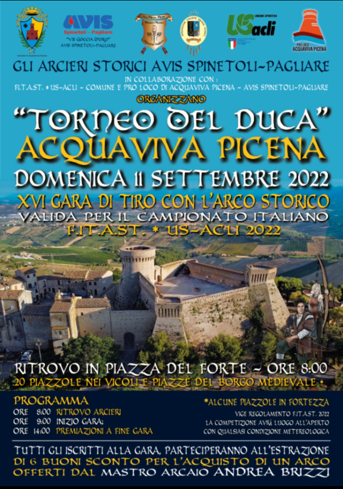 ACQUAVIVA PICENA – L’Amm.ne Com.le di Acquaviva Picena in collaborazione con l’Associazione ARCO AVIS di Spinetoli – Pagliare (associata F.IT.A.ST. US-ACLI-FITARCO) ha organizzato per domenica 11 settembre il “Torneo del duca” dalle ore 8:00 alle ore 13:00. Trattasi di una manifestazione sportiva di tiro con l’arco storico, valida per il campionato italiano. “Gli arcieri si sfideranno con bersagli posizionati lungo le vie di tutto il centro storico. Sarà un evento itinerante che consentirà ad atleti e spettatori di ammirare gli angoli più belli di Acquaviva Picena, considerando soprattutto quanto “ad hoc” sia il nostro patrimonio storico per questo genere di manifestazioni. Gli spettatori, oltre ad assistere alle gare, potranno, in piazza San Rocco, provare l’emozione di tirare con l’arco storico dietro la guida di personale esperto, previa iscrizione direttamente sul luogo. Siamo certi che risulterà emozionante assistere a questo tipo di evento e ci aspettiamo la partecipazione di tutta la cittadinanza, dei paesi limitrofi e dei turisti ancora in vacanza nel Piceno. Ringraziamo il presidente Vagnoni, l’Assessore Marianna Spaccasassi ed i consiglieri Fabio Capretti e Patrizia Di Girolamo che in questi giorni si stanno “materialmente” impegnando alla realizzazione della manifestazione, certi che questo evento avrà ad Acquaviva un futuro negli anni che verranno”.