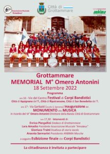 GROTTAMMARE – In occasione del decimo anniversario della morte del Maestro Omero Antonini, l’Associazione Musicale Amadeus, in collaborazione con l’Associazione ANBIMA Marche, organizza per domenica 18 settembre, lungo le vie del centro, un Memorial in onore del musicista grottammarese scomparso prematuramente, che è stato direttore della Banda Città di Grottammare e che tanto ha donato alla comunità e alla musica. L’evento, che è patrocinato e sostenuto economicamente dal Comune di Grottammare e vedrà la partecipazione di numerosi Corpi Bandistici, sarà un ricordo appassionato del Maestro Antonini e un omaggio al mondo della musica, a lui tanto caro.