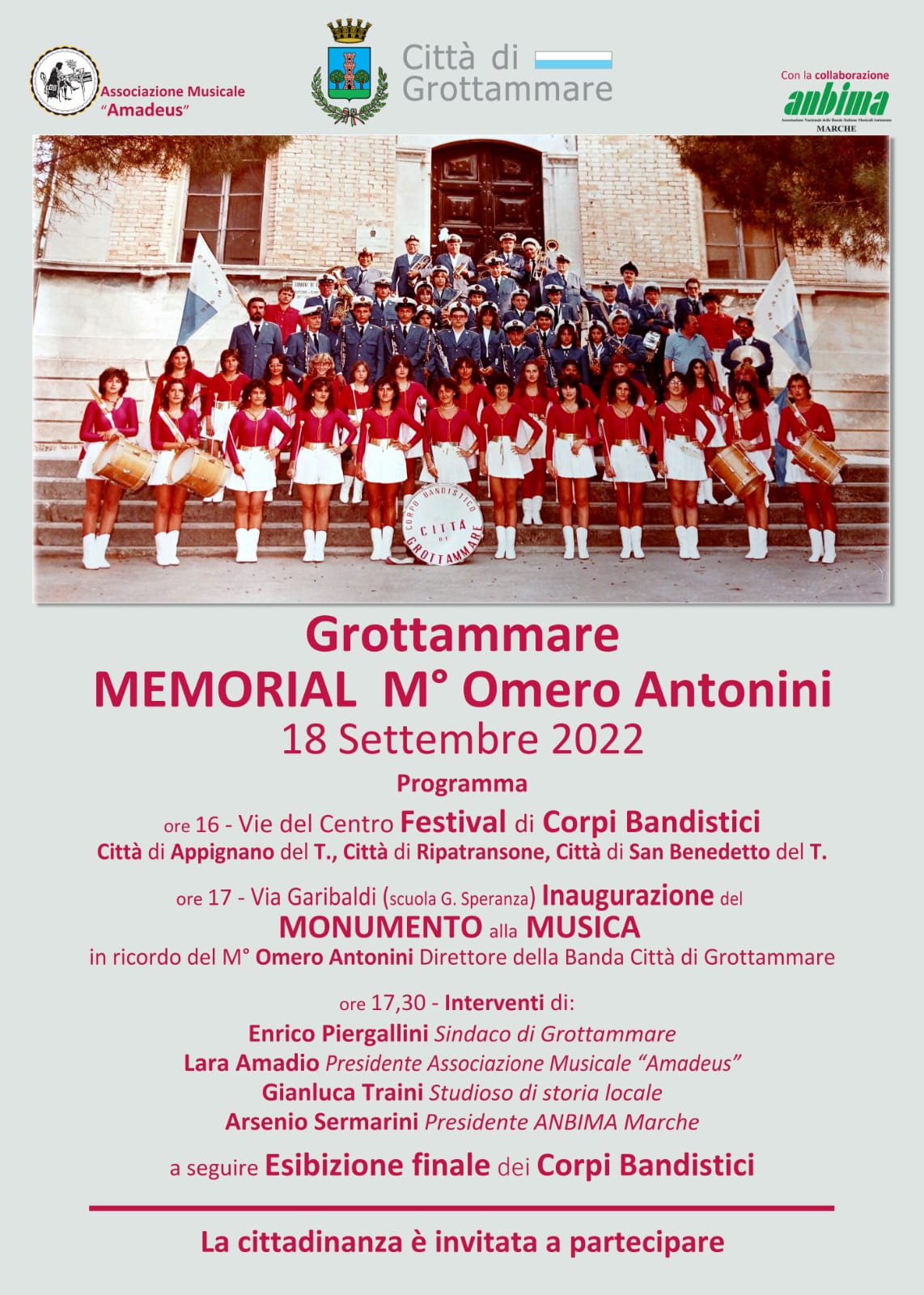 All’evento interverranno il primo cittadino di Grottammare, prof. Enrico Piergallini, il presidente dell’Associazione Musicale “Amadeus”, prof.ssa Lara Amadio, lo studioso di storia locale Gianluca Traini, il presidente di “ANBIMA Marche”, Arsenio Sermarini.