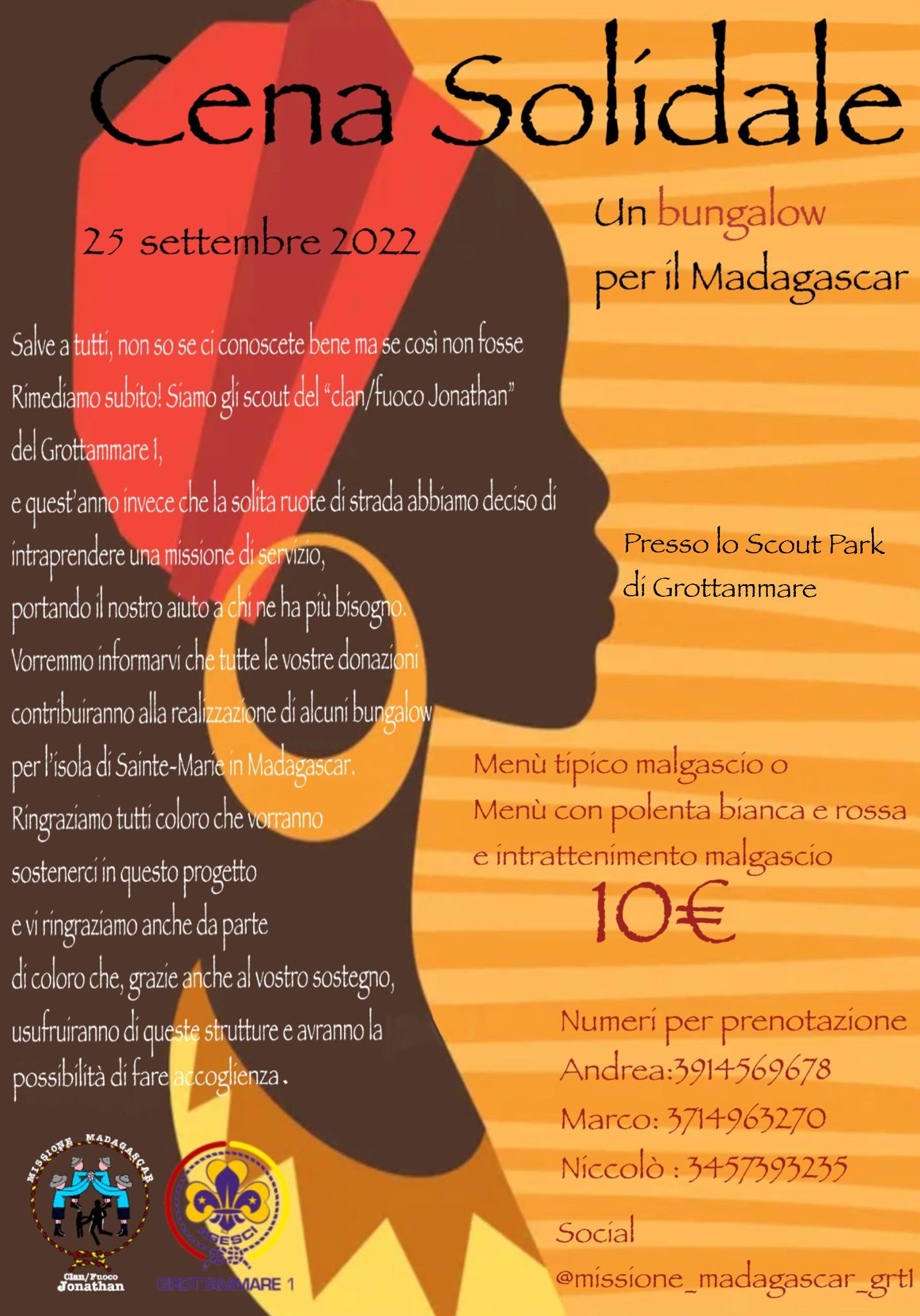 “Alla cena, – proseguono i tre scout – oltre a noi ragazzi e a don Benvenuto, ci saranno anche alcune suore malgasce che prepareranno un delizioso menù con piatti tipici della loro isola; ma, per chi non avesse voglia di assaggiare nuovi sapori, sarà comunque possibile gustare un menù con polenta bianca o rossa. Durante la serata ci sarà anche un intrattenimento musicale con suoni e canti tipici della cultura malgascia. Il costo della cena è di soli 10 euro a persona e il ricavato, insieme ad eventuali donazioni, contribuirà – come abbiamo già detto – alla realizzazione di questi bungalow in Madagascar.”