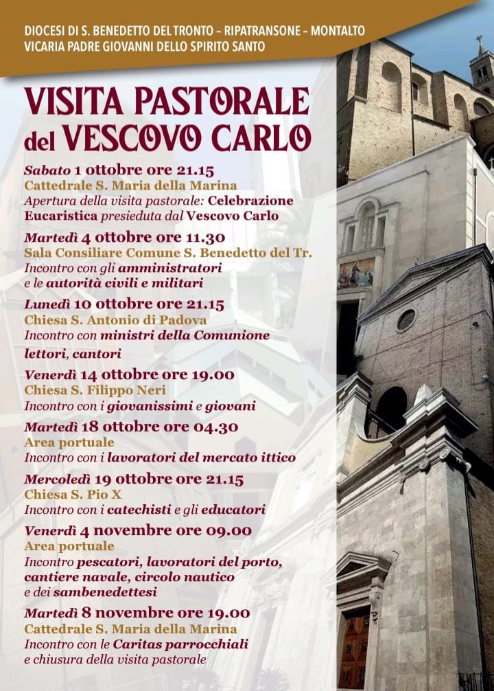 DIOCESI– Si aprirà domani, sabato 1 ottobre, alle ore 21:15, presso la Cattedrale Santa Maria della Marina di San Benedetto del Tronto, la visita pastorale del vescovo Carlo Bresciani nella vicaria Padre Giovanni dello Spirito Santo.