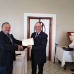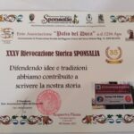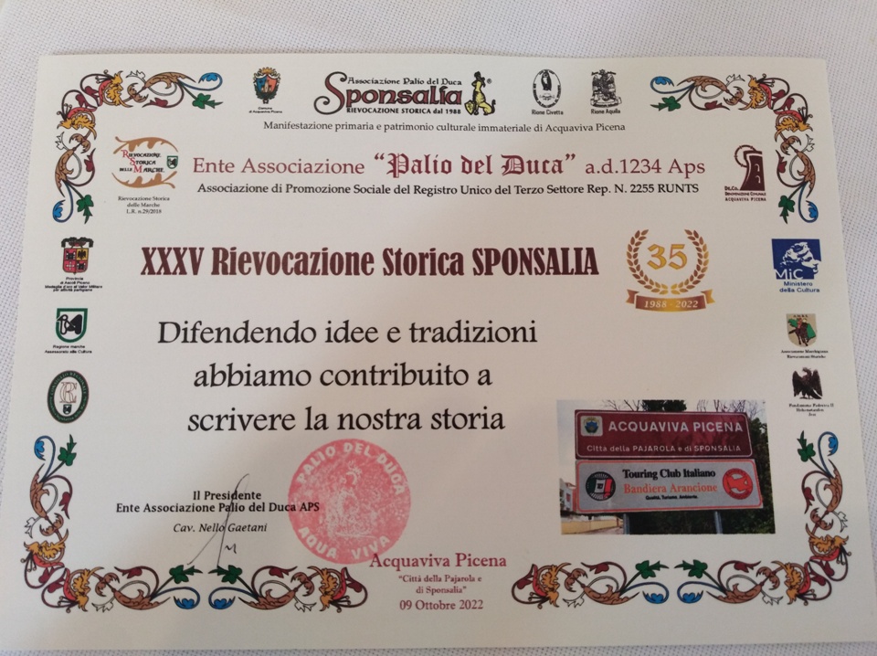 Nella serata del venerdì non si registrava una così alta presenza di pubblico da alcuni anni. Con orgoglio vi comunico che il Banchetto Nuziale Medievale ha registrato un grande successo, i presenti sono rimasti colpiti dalla bontà delle pietanze e per questo ringrazio vivamente lo chef Emidio Mistretta, dagli spettacoli e ringrazio qui tutti gli artisti che sono intervenuti, dalla bellissima ubicazione dell’evento e cioè la Fortezza Medievale di Acquaviva Picena. Riguardo il Banchetto voglio ringraziare tutti i ragazzi che hanno svolto il servizio ai tavoli. Per l’edizione 2022 di Sponsalia è stata inserita una novità, una giornata, quella del sabato, dedicata ai bambini, l’abbiamo chiamata “I ludi di Sponsalia”. Dopo il successo riscosso per questa edizione, l’Associazione pensa di riproporla il prossimo anno. Festeggiando oggi i nostri trentacinque anni di attività sottolineo che l’Ente Associazione Palio del Duca fa parte dell’Associazione Marchigiana Rievocazioni Storiche e io all’interno di essa ricopro al carica di vice presidente, alla federazione Italiana e Confederazione Europea Festa e Manifestazioni Storiche. La Regione Marche ci ha riconosciuto come “Rievocazione Storica delle Marche” avendo superato i trentacinque anni di continua attività e assegnato un contributo per il 2022 e il 2023. Il Ministero dei Beni Culturali ci ha concesso un contributo per l’anno 2022. Abbiamo partecipato anche al Bando per le Rievocazioni Storiche, su trecentonovanta che hanno fatto richiesta, duecentotrenta hanno ottenuto i contributi, il Palio del Duca si è piazzato al settantesimo posto. Il Comune di Acquaviva Picena ci ha riconosciuto il marchio De.Co., inoltre siamo finiti nei cartelloni indicativi del Comune di Acquaviva Picena: “Città della pajarola e di Sponsalia”. Da aprile 2022 siamo diventati ENTE Associazione Palio del Duca APS iscritta al RUNTS con il numero 2255. Abbiamo partecipato a Marche storia il 16 – 17 – 18 settembre a Monteprandone, il sindaco è stato molto entusiasta della manifestazione e già pensa di organizzare due giorni di rievocazione del cavaliere Prandone. Nel 2023 torneremo ad aiutare il Palio del Barone di Tortoreto, che dopo tre anni di sospensione intendono ripartire alla grande. Vi ricordo che collaboriamo anche con il Palio dei Castelli di San Severino Marche. Stiamo organizzando con la Fondazione Federico II di Jesi il convegno di domenica 20 novembre in occasione della “Giornata della Storia”, il tema di questa edizione sarà: “Piacere, salute, arte e passioni del Medioevo”, tre saranno i relatori tra i quali Pier Paolo Pederzini. Per convenzione con la passata Amministrazione Comunale gestiremo la Fortezza il Museo fino al 31 gennaio 2025. Nel biglietto d’ingresso alla Fortezza abbiamo inserito uno sconto del 10 per cento presso le strutture ricettive del nostro territorio, questa scelta è stata apprezzata dai turisti e dalle attività che ne hanno tratto beneficio. La Sala del Palio sarà nostra sede fino al 2028, rinnovabile fino al 2034. Stiamo andando in stampa con il calendario storico di Sponsalia 2023, il calendario storico ha raggiunto la ventisettesima edizione. Come nel 2012, abbiamo deliberato con il Consiglio Direttivo la pubblicazione degli Atti dei convegni dal 2012 al 2023. Stiamo provvedendo ad aggiornare anche il nostro sito internet. Lascio la parola al presidente dell’Associazione Terraviva cav. Filippo Gaetani e al primo presidente dell’Associazione Palio del Duca Fabrizio Ioannone”. Filippo Gaetani ha detto: “Saluto tutti voi, tutte le autorità presenti. Di solito quando si festeggiano gli anniversari di questo tipo, quelli che erano stati i primi vengono a mancare, per fortuna invece oggi ci siamo tutti a festeggiare questo importante avvenimento. Stare qui oggi mi fa tornare in mente i primi tempi, in particolare ora ricordo quando si stava organizzando la realizzazione dei primi costumi, le stoffe ce le procurammo da Nello, a questo punto alcuni mi dissero che ci eravamo messi d’accordo, che tra noi c’era una “combina”, beh ora a distanza di trentacinque anni posso affermare che non ci fu mai una “combina” però sono ancora “i due Gaetani” a portare avanti questo progetto e altri, oggi Acquaviva Picena è: “Il paese della pajarola e di Sponsalia”. Io mi auguro di ritrovarci qui tra trentacinque anni e festeggiare i settant’anni di attività. Vi auguro un buon proseguimento”. Fabrizio Ioannone ha detto: “Io ringrazio Nello dell’invito.