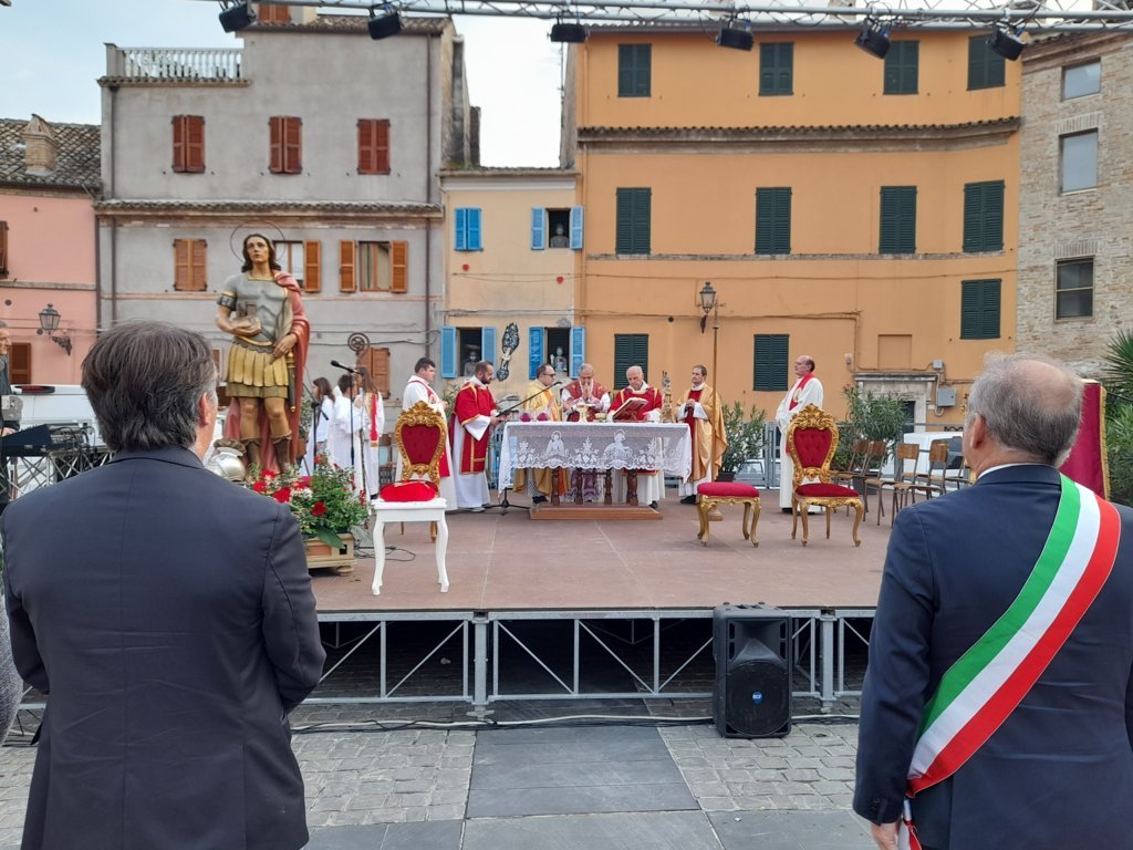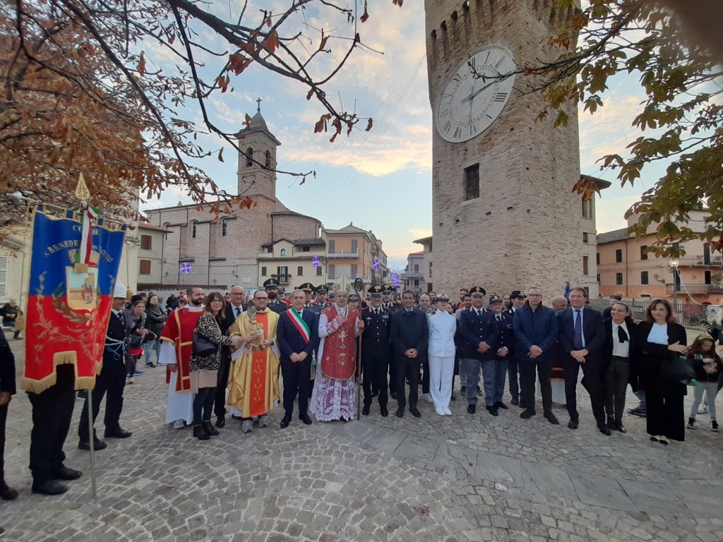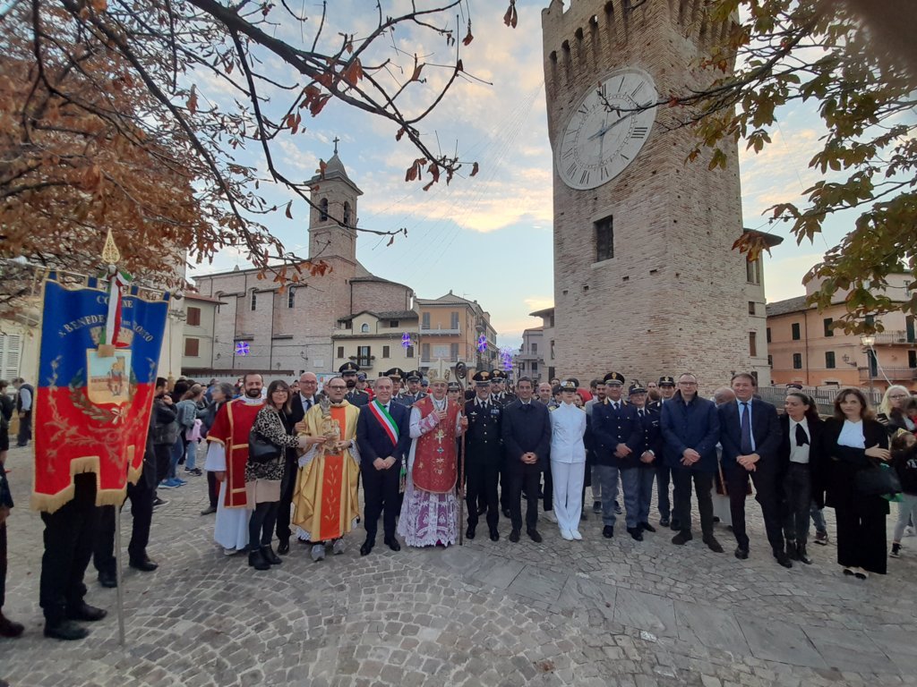 Queste le parole del vescovo Bresciani durante l’omelia: “La celebrazione della festa del patrono, come è giusto, riunisce sempre tutta la città, autorità civili e militari – alle quali do un cordiale benvenuto- insieme alla popolazione e al clero cittadino. Insieme riconosciamo in San Benedetto aspetti della vita e virtù personali capaci di ispirare la nostra vita cristiana e civile, in altre parole, la nostra vita di cittadini cristianamente ispirata. In quanto patrono della città, la solennità ci invita a riflettere sulla città che noi abitiamo, soprattutto sul nostro modo di abitarla, assumendoci le responsabilità che competono a ciascuno di noi. Ogni città è caratterizzata da un certo spirito, che qualcuno ha chiamato lo spirito del luogo, e che in molti aspetti la distingue da tutte le altre città. Si tratta del frutto della storia vissuta e costruita dai suoi abitanti, con il loro carattere, la loro intraprendenza, ma anche del luogo geografico in cui si situa la città. Tutto ciò ha contributo a formare la personalità dei suoi abitanti, molto spesso anche con il loro modo di esprimersi del tutto particolare – il dialetto – come è il dialetto sambenedettese, per esempio. Non da ultimo ha contribuito certamente anche la fede degli abitanti, basta guardare alla nostra città e ai molti campanili che con il suono delle loro campane segnano i momenti più importanti della vita, non solo religiosa. Mi si dice che il campanile di questa chiesa di San Benedetto, nella quale stiamo celebrando questa Eucaristia, in passato facesse da faro ai nostri pescatori che rientravano in porto: vero punto di riferimento della fede, ma non solo. Lo spirito della nostra città è certamente impregnato della tradizione forte di una fede popolare che trovava in questa abbazia il punto di riferimento tanto da dare il nome stesso alla città. Ogni città ha bisogno di un’anima, non è fatta soltanto da una convivenza uno vicino all’altro. L’anima di una città è alimentata dal senso di appartenenza di ciascuno e di cui essa ha bisogno. Quando perde quest’anima, la sua vitalità e la sua proiezione al futuro si affievolisce e rischia addirittura di spegnersi. Come l’anima dà vita a tutto il corpo e lo tiene unito, così l’anima della città è la fonte della sua vitalità e della sua unità.”