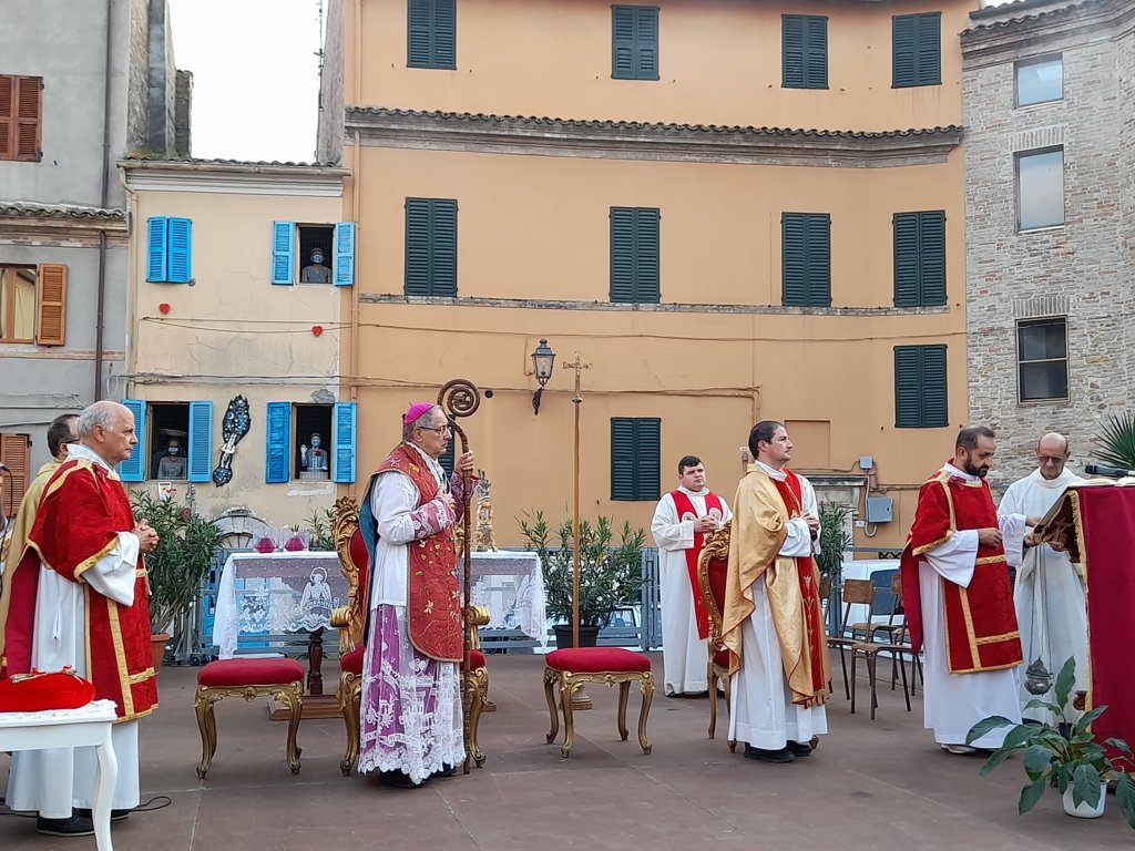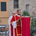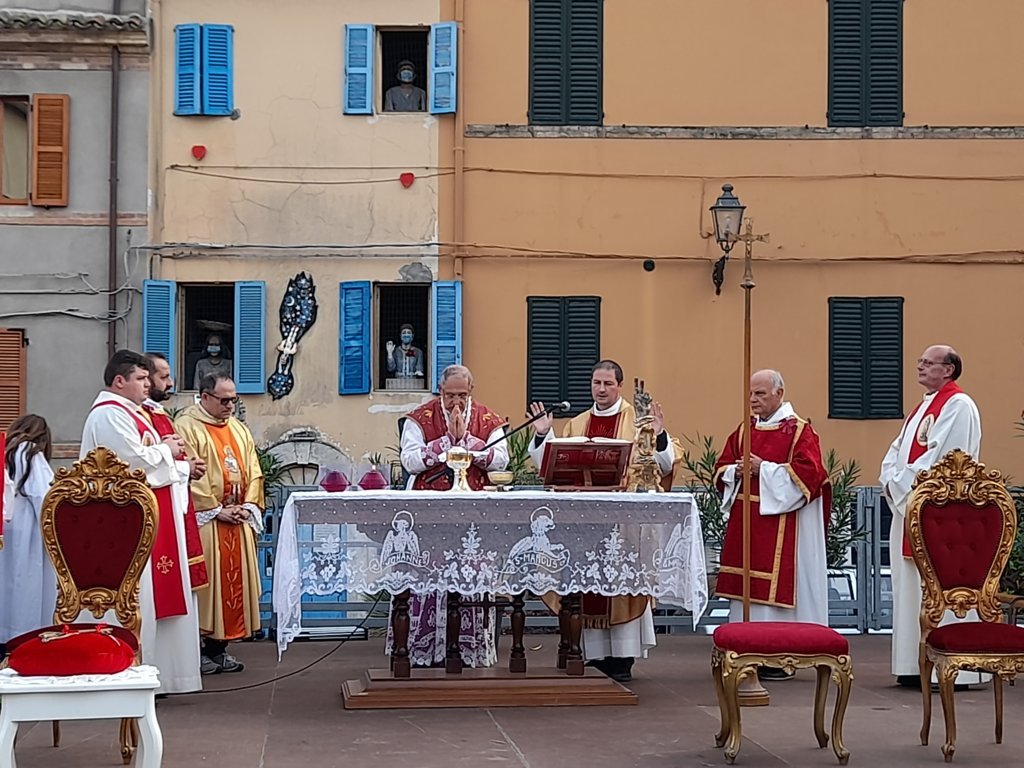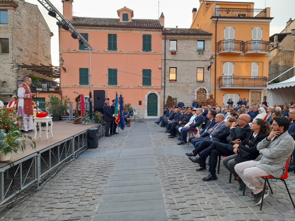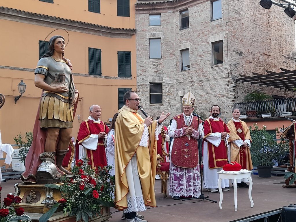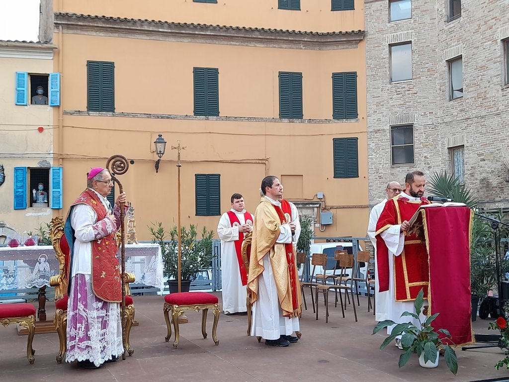SAN BENEDETTO DEL TRONTO – Dopo dieci giorni di pellegrinaggio per le parrocchie della vicaria Padre Giovanni dello Spirito Santo, la reliquia di San Benedetto Martire è tornata nella sua “casa” per i festeggiamenti solenni che si sono tenuti ieri, 13 ottobre, alle ore 17:00, presso piazza Bice Piacentini, in onore del Santo patrono della città di San Benedetto del Tronto. La Santa Messa, presieduta dal vescovo Carlo Bresciani, è stata concelebrata da don Guido Coccia, don Gianni Capriotti, Padre Mario e Padre Ionut e servita dai diaconi Emanuele Imbrescia e Walter Gandolfi. Presenti molte autorità civili e militari.
