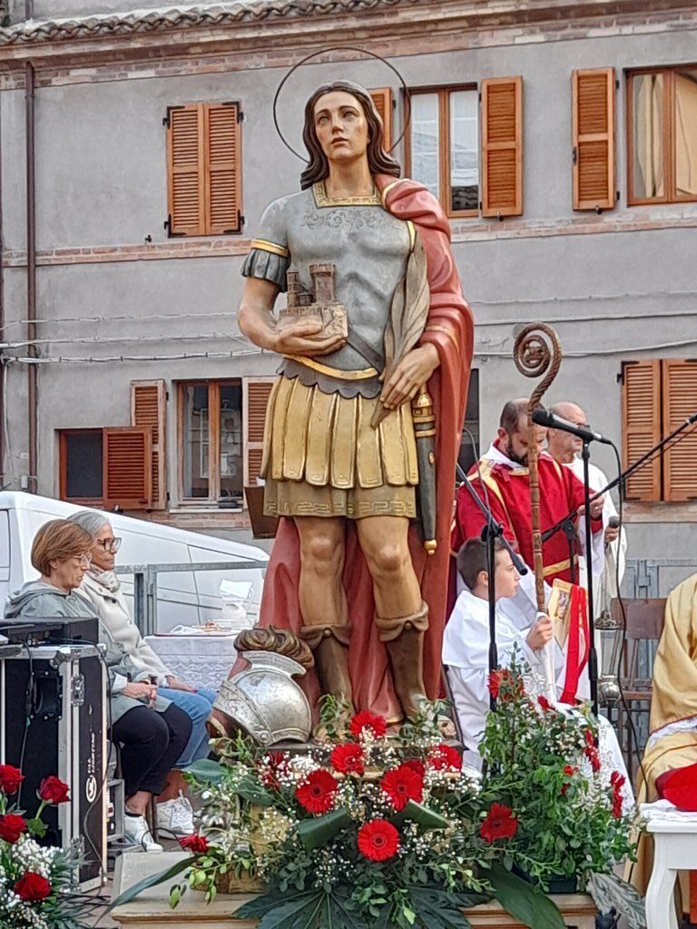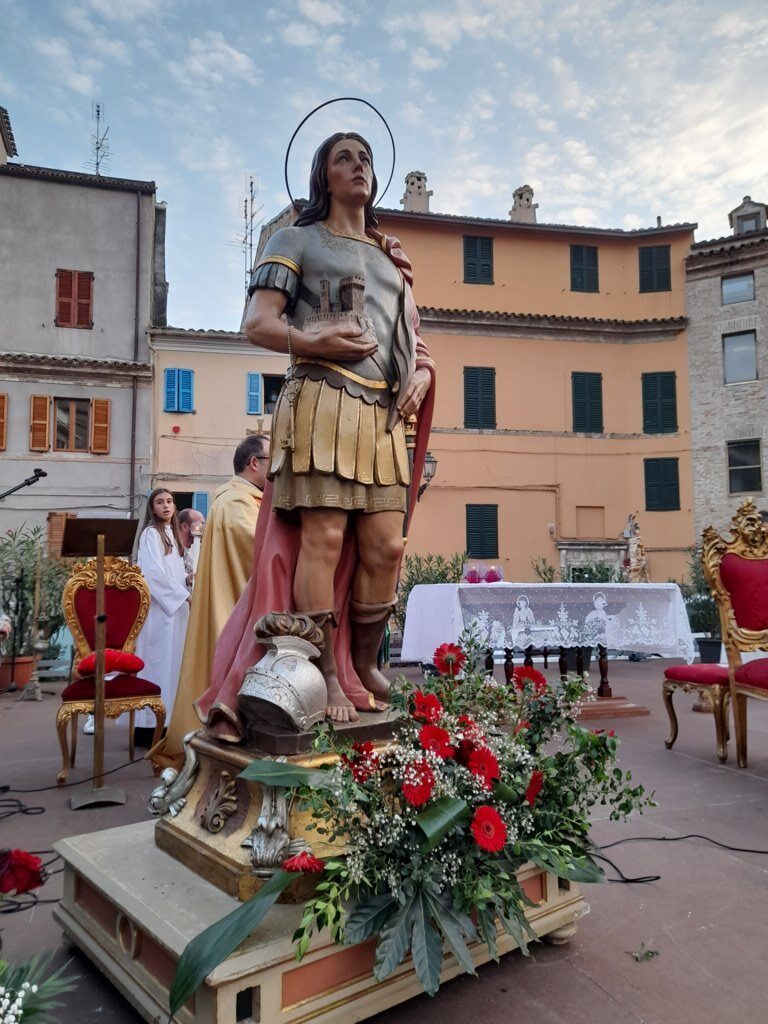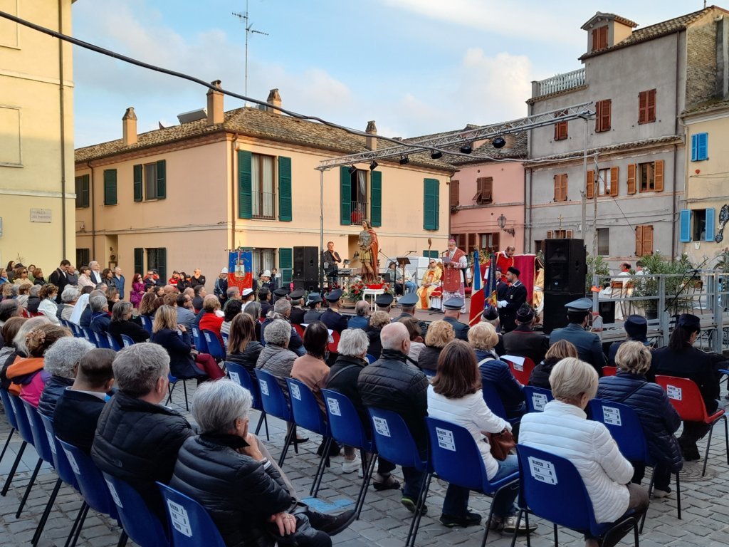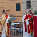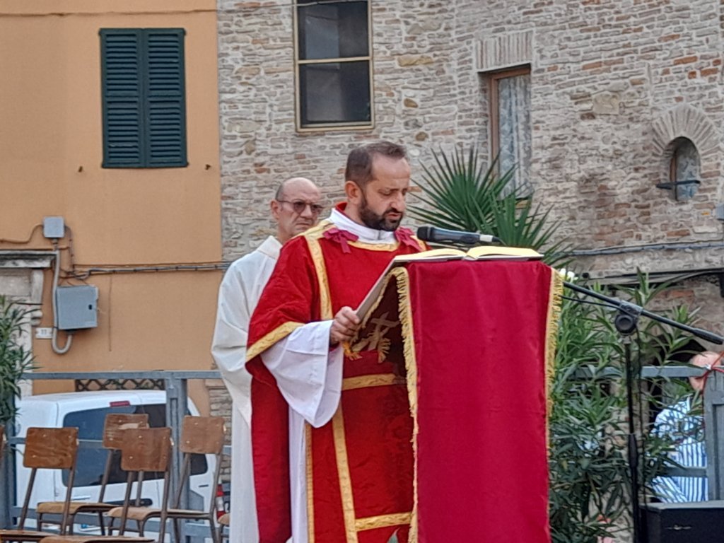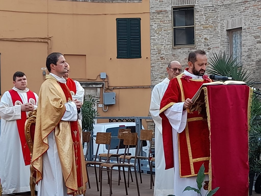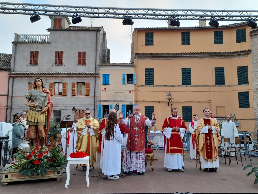 SAN BENEDETTO DEL TRONTO – Dopo dieci giorni di pellegrinaggio per le parrocchie della vicaria Padre Giovanni dello Spirito Santo, la reliquia di San Benedetto Martire è tornata nella sua “casa” per i festeggiamenti solenni che si sono tenuti ieri, 13 ottobre, alle ore 17:00, presso piazza Bice Piacentini, in onore del Santo patrono della città di San Benedetto del Tronto. La Santa Messa, presieduta dal vescovo Carlo Bresciani, è stata concelebrata da don Guido Coccia, don Gianni Capriotti, Padre Mario e Padre Ionut e servita dai diaconi Emanuele Imbrescia e Walter Gandolfi. Presenti molte autorità civili e militari.