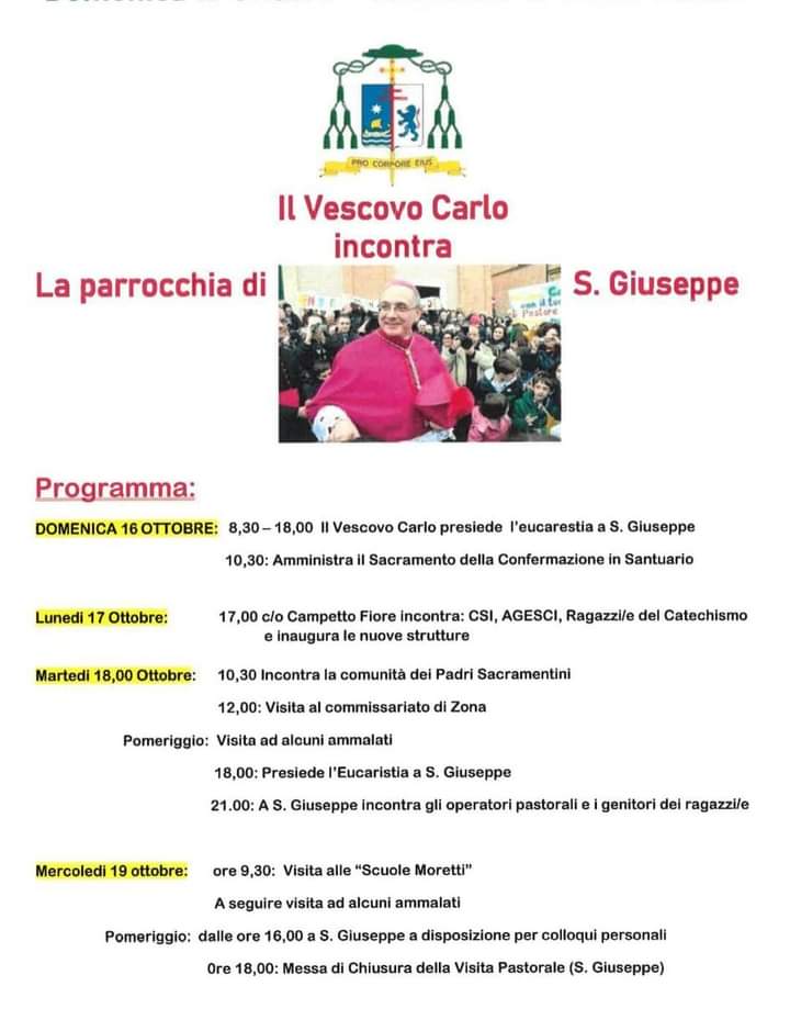 Questo il programma che attende il Vescovo Carlo nei prossimi giorni: