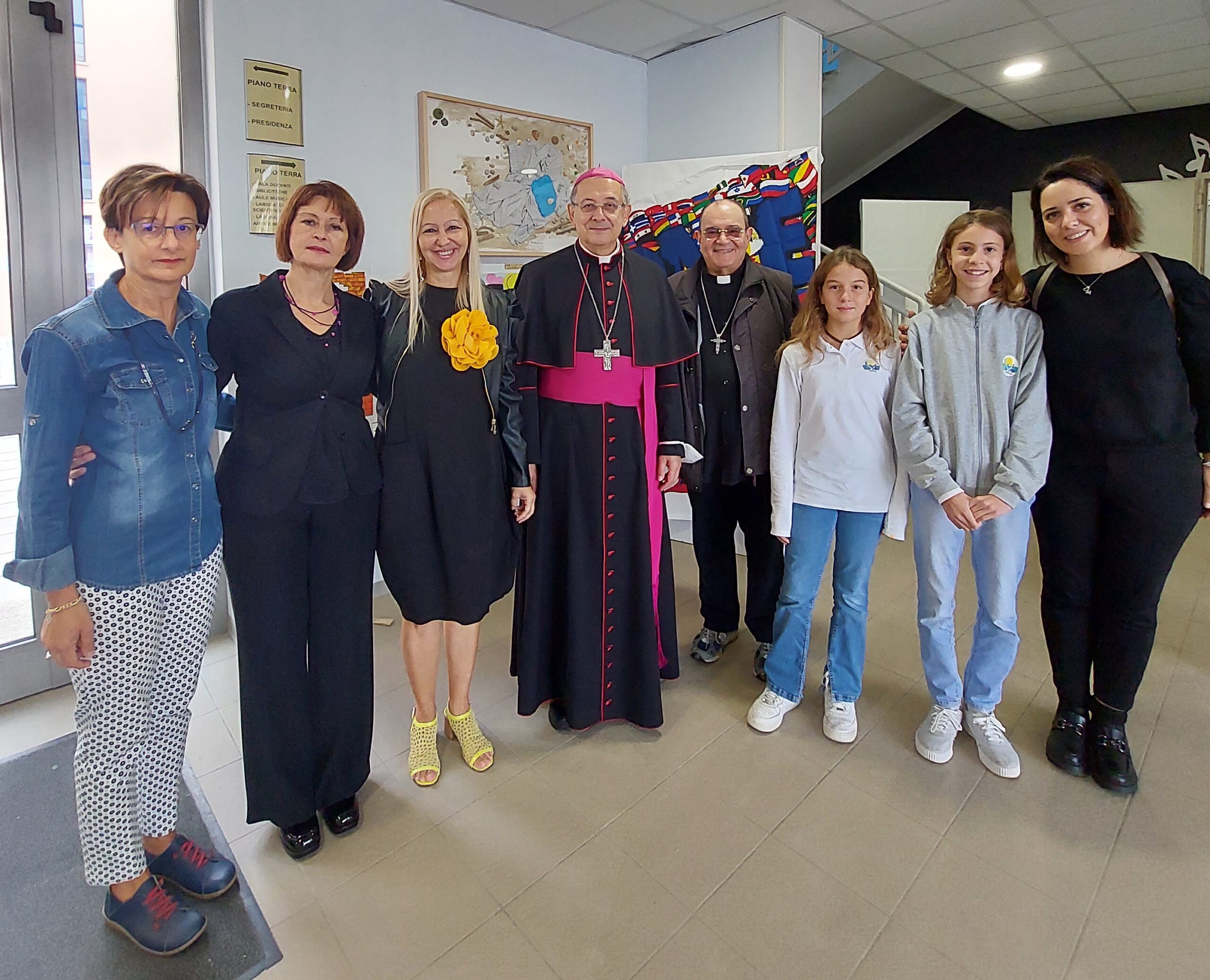 SAN BENEDETTO DEL TRONTO – Il vescovo della Diocesi di San Benedetto, Monsignor Carlo Bresciani ha incontrato gli alunni della scuola secondaria “Curzi” in occasione della visita pastorale. Sua eminenza è stato accolto dalla dirigente dell’Isc Centro, Elisa Vita, assieme ai docenti e al personale ATA, sul piazzale dell’istituto dove gli alunni di terza B diretti dalla professoressa Stefania Di Sante hanno eseguito un brano musicale per poi lasciare spazio al confronto tra il vescovo e gli studenti. Mons. Carlo si è intrattenuto con i ragazzi di tutte le classi che gli hanno esposto alcune riflessioni sul senso della vita, sulle loro preoccupazioni di adolescenti proiettati nelle future scelte scolastiche e di vita, sulle difficoltà di relazionarsi con gli adulti e altri temi molto profondi a cui Monsignor Bresciani ha risposto in modo semplice, incoraggiando i ragazzi a cercare sempre il bello e la speranza in ciò che li circonda e ad agire per il conseguimento del bene comune. Un pensiero è stato rivolto ai loro coetanei vittime della guerra in Ucraina, con la speranza che si giunga ad una soluzione pacifica. Alla domanda su come si diventa vescovo, Mons. Carlo ha raccontato della chiamata del Papa che lo ha incaricato di curare la Diocesi di San Benedetto del Tronto. Gli alunni, guidati dalla docente di religione Paola Amabilli, hanno poi avuto modo di mostrargli la pietra d’inciampo posta all’ingresso della scuola, in ricordo dello studente del Mali annegato con la pagella cucita nella giacca, e gli “angoli dei diritti”: spazi di riflessione sull’importanza della custodia e del rispetto del pianeta e delle relazioni umane.