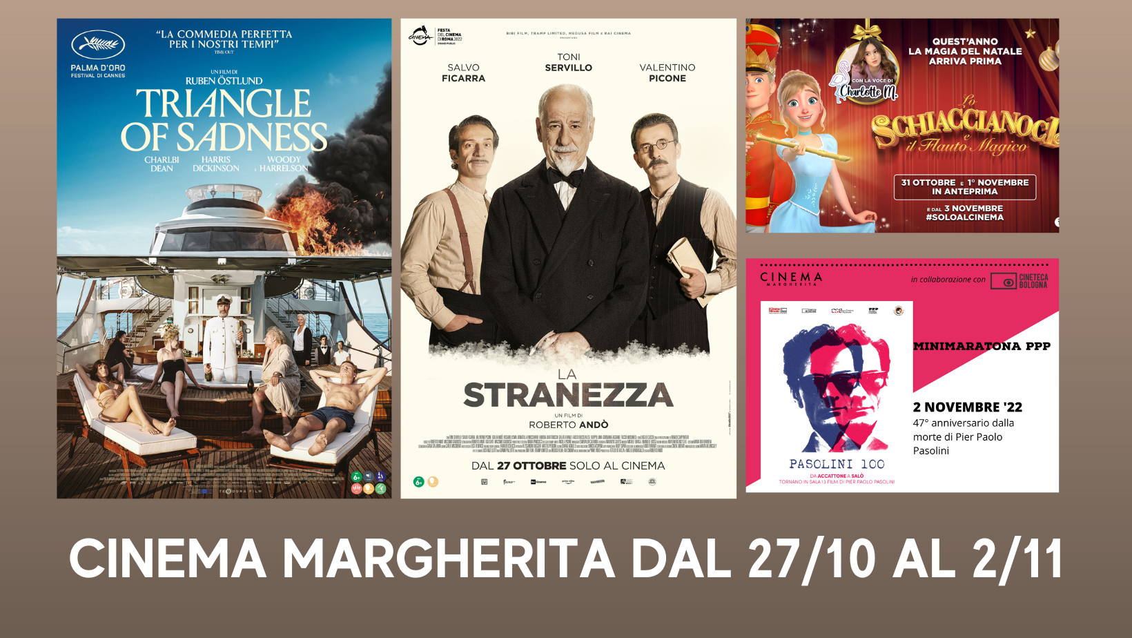 CUPRA MARITTIMA – Questa settimana al cinema Margherita si sviluppa all’insegna della provocazione e del sovvertimento dell’ordine. La programmazione inaugura all’insegna della bizzarria con La stranezza di Roberto Andò, animato da un brillante cast: Toni Servillo e Ficarra e Picone. Il film racconta, con i toni della commedia, la storia della genesi del capolavoro di Luigi Pirandello Sei personaggi in cerca d’autore. Più eccentrico e caustico, arriva finalmente in sala il film vincitore della Palma d’oro al festival di Cannes 2022, Triangle of sadness, l’ultima, irriverente opera di Ruben Östlund, già autore del visionario The Square e Forza maggiore . Una crociera per ricchi su un lussuoso yatch diventa l’occasione per esplorare in modo grottesco i temi della lotta di classe e del mito della bellezza. Si iniziano ad avvertire già le prime atmosfere natalizie con Lo schiaccianoci e il flauto magico, nuova versione del classico in versione animata. Il 2 novembre si conclude il percorso dedicato all’opera di Pier Paolo Pasolini, in occasione del centenario della sua nascita. Il Cinema Margherita ha proposto per tutto l’anno con cadenza regolare la proiezione di film di Pasolini, da Accattone a Uccellacci e uccellini. A conclusione ideale di questo approfondimento pasoliniano, abbiamo pensato alla Minimaratona PPP con tre film, proiettati uno di seguito all’altro, per consentire un’immersione assoluta nell’universo visionario e dissacrante del regista. Si parte con Teorema, recentemente restaurato, in cui il sacro incontra il perturbante; si procede con La ricotta, quarto episodio del film collettivo RoGoPaG, ricco di riferimenti figurativi alla storia dell’arte italiana e di citazioni da testi sacri; per concludere con Salò o le 120 giornate di Sodoma, ultimo film di Pasolini e opera paradigmatica per comprendere il suo percorso cinematografico e artistico tout court, le sue riflessioni sul potere e il suo credo nel “diritto a scandalizzare”.
